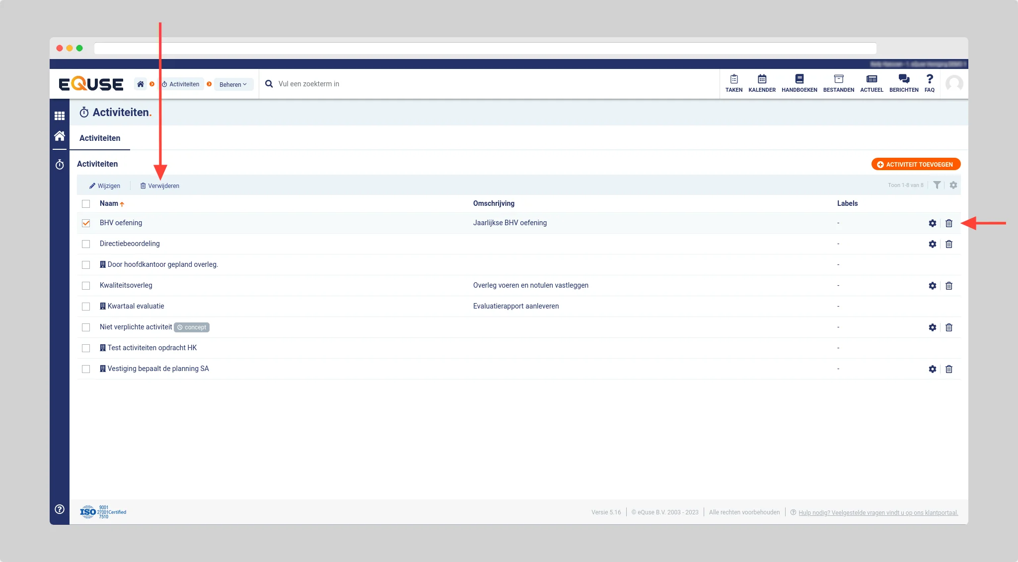 - Selecteer de activiteit die u wilt verwijderen door het selectievakje aan te klikken en klik op verwijderen of klik op het prullenbak icoontje.
