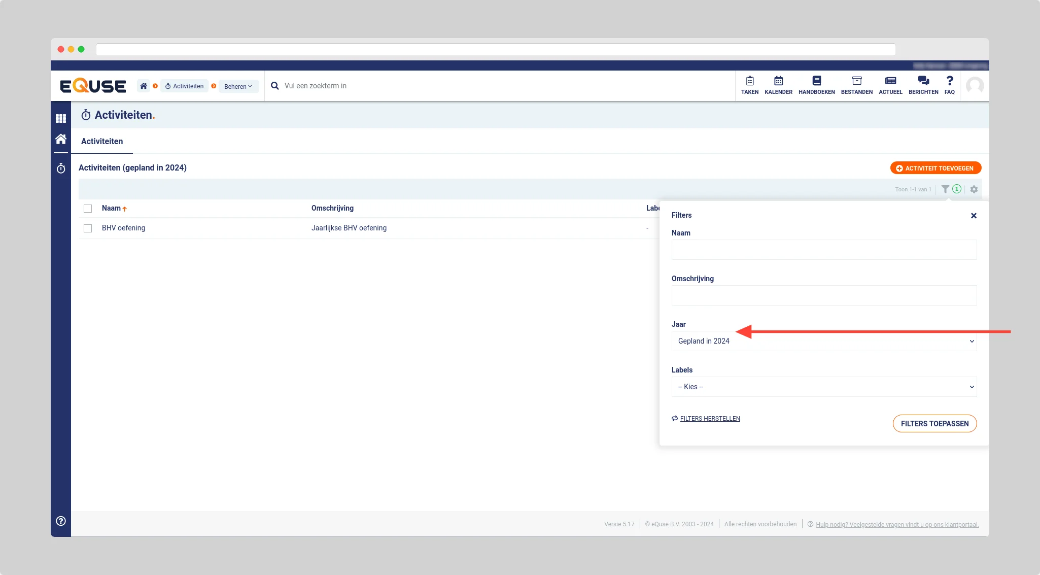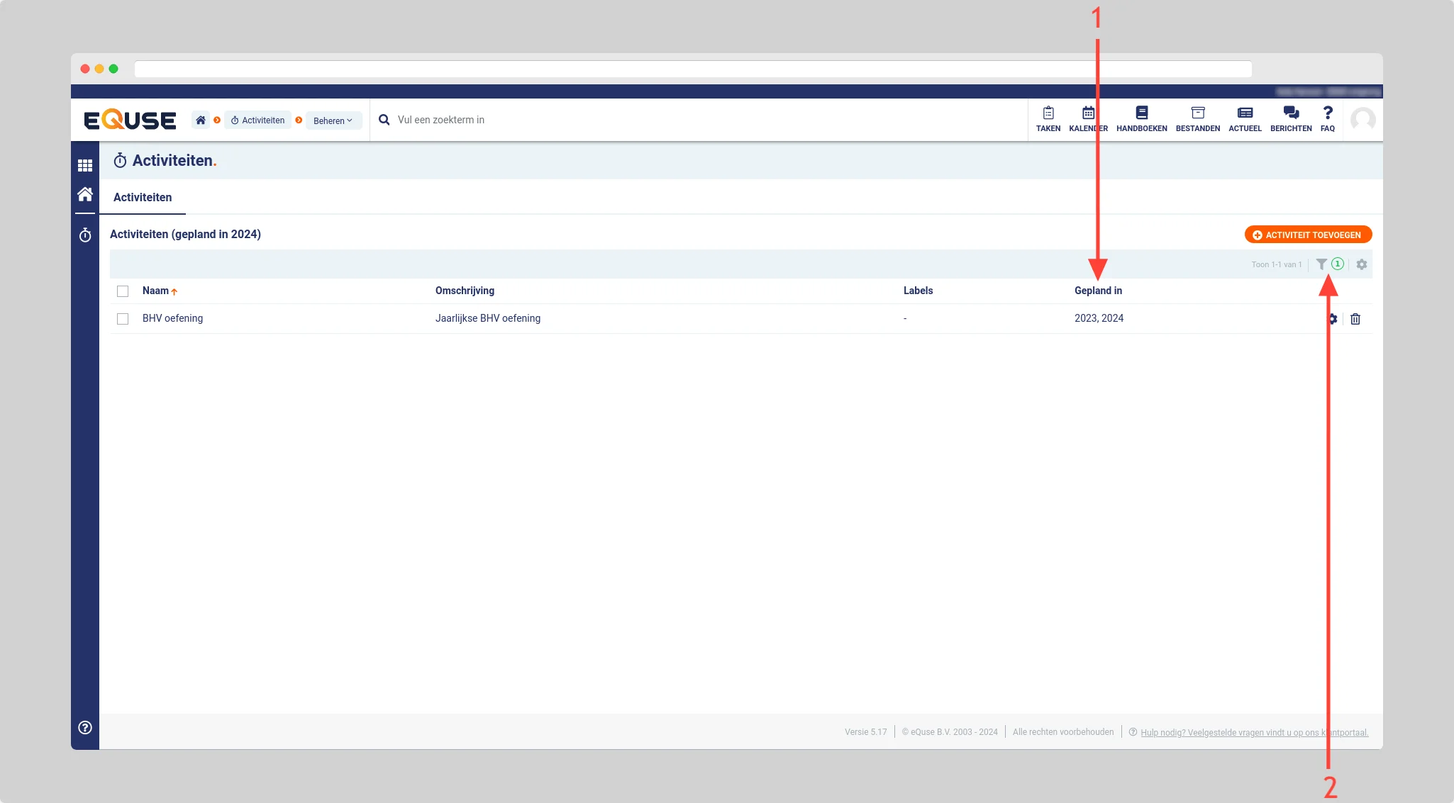 De lijstweergave in de beheer omgeving van planbare items (modules activiteiten, indicatoren, verbetermaatregelen en onderhoud) worden standaard gefilterd op items gepland in het huidige jaar (1). Door het aanpassen van de filter instellingen (2) kunt u eventueel zelf een jaar selecteren om de lijst op te filteren (de items worden getoond aan de hand van de einddatum van de taken).