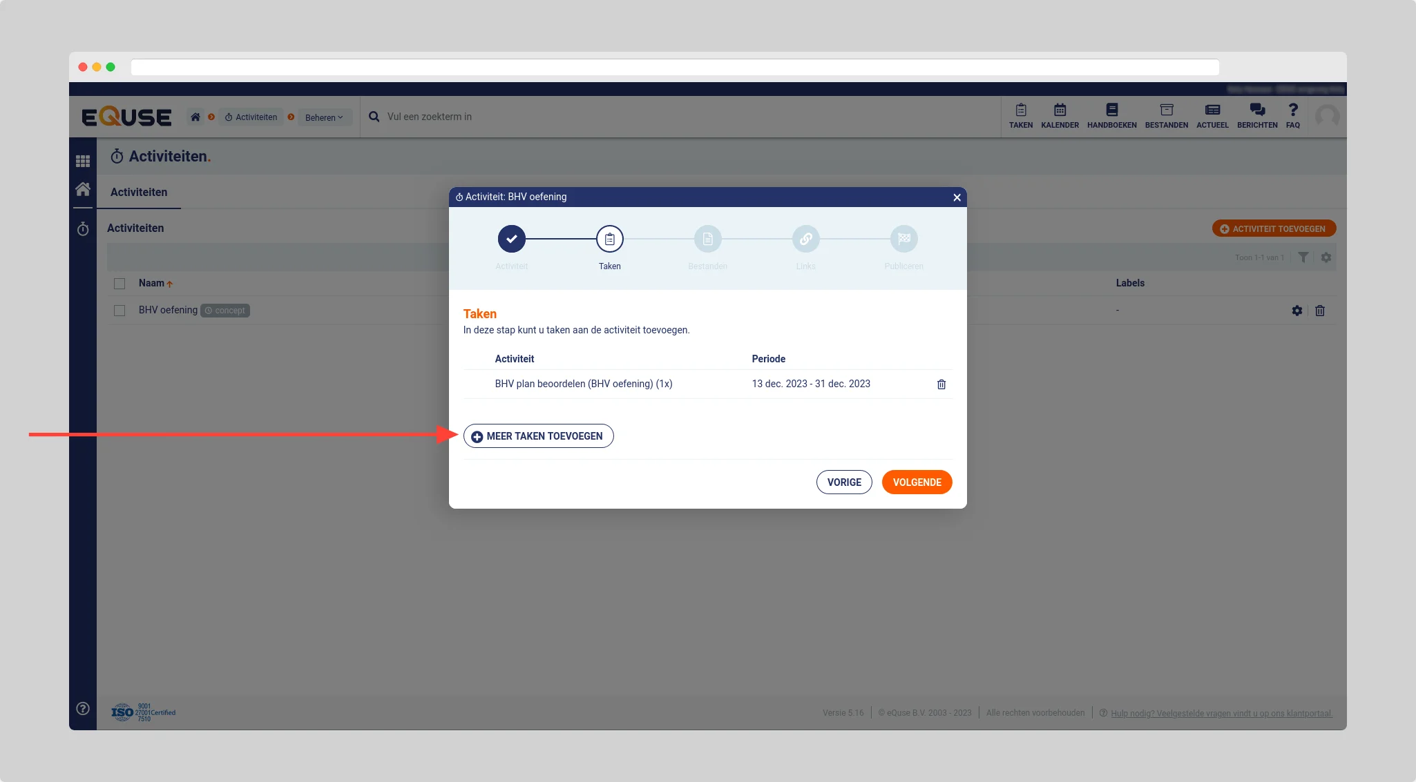 Bij het toevoegen van een activiteit kunt u bij de stap taken één of meerdere taken toevoegen. Klik na het toevoegen van een taak op meer taken toevoegen om nog een taak toe te voegen.