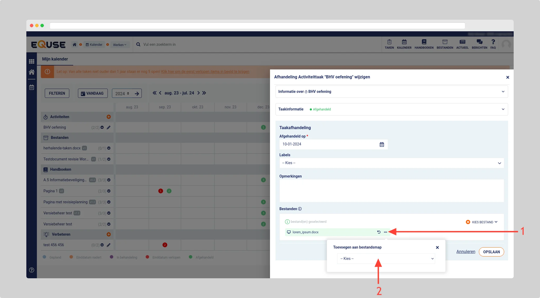 U heeft bij het afhandelen van een activiteit de mogelijkheid om bestanden toe te voegen. Deze bestanden zijn standaard alleen via de afhandeling van de activiteit inzichtelijk. Wanneer u deze bestanden ook wilt opslaan in de module Bestanden, dan kunt u dat doen door bij het toevoegen van een bestand vanaf uw computer, na dat u het bestand geselecteerd heeft, op de drie puntjes (1) te klikken. Vervolgens heeft u de mogelijkheid om het bestand ook meten in een bestandsmap (2) in de module Bestanden te plaatsen.