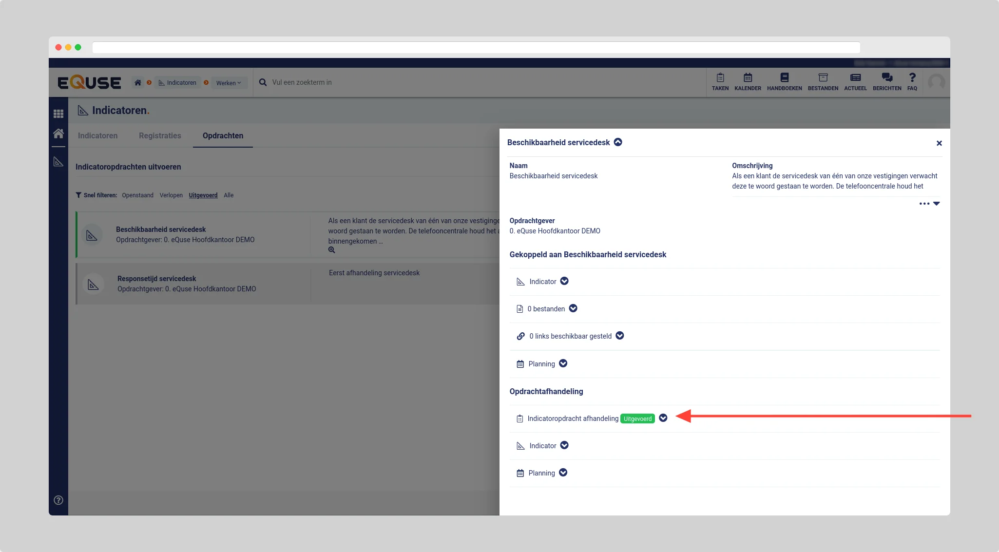Klik in het overzicht van indicatoropdrachten op de opdracht waarvoor u de opdrachtafhandeling (uitvoering) wilt bekijken. Klik vervolgens onderaan in het zijpaneel, bij opdrachtafhandeling, op h et pijltje om de afhandeling te bekijken.