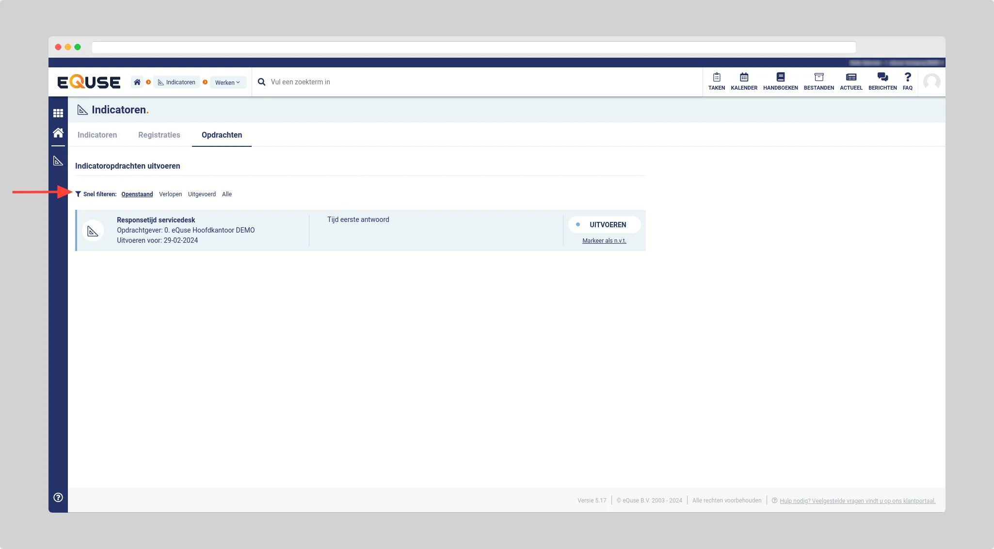 Met de optie snel filteren kunt u het overzicht filteren op openstaande, verlopen, uitgevoerde of alle indicatoropdrachten. De status van een indicatoropdracht wordt aan de hand van verschillende kleuren weergegeven (bijvoorbeeld groen voor uitgevoerd).