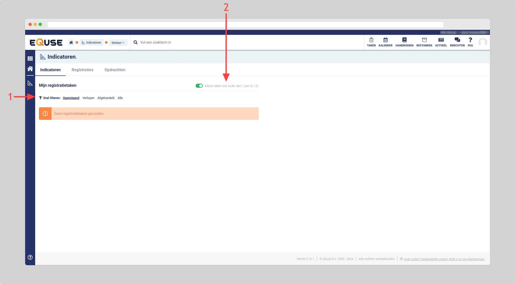Het aantal registraties dat wordt weergegeven is afhankelijk van de ingestelde snel filteren opties (1) en de optie alleen taken niet ouder dan 1 jaar (2).