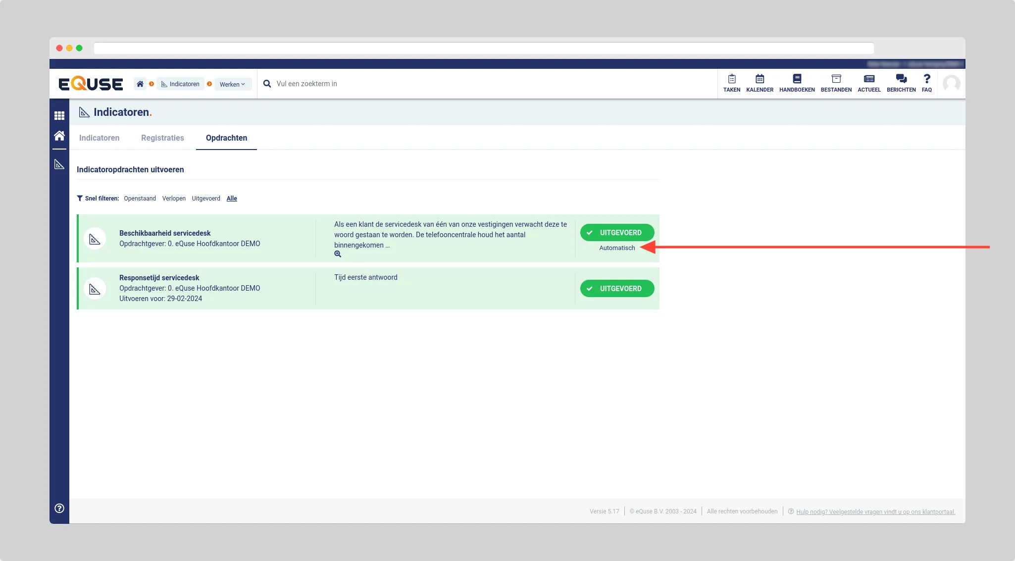 Wanneer een indicatoropdracht automatisch is uitgevoerd dan zal dit worden weergegeven door middel van het woord automatisch direct onder de status
