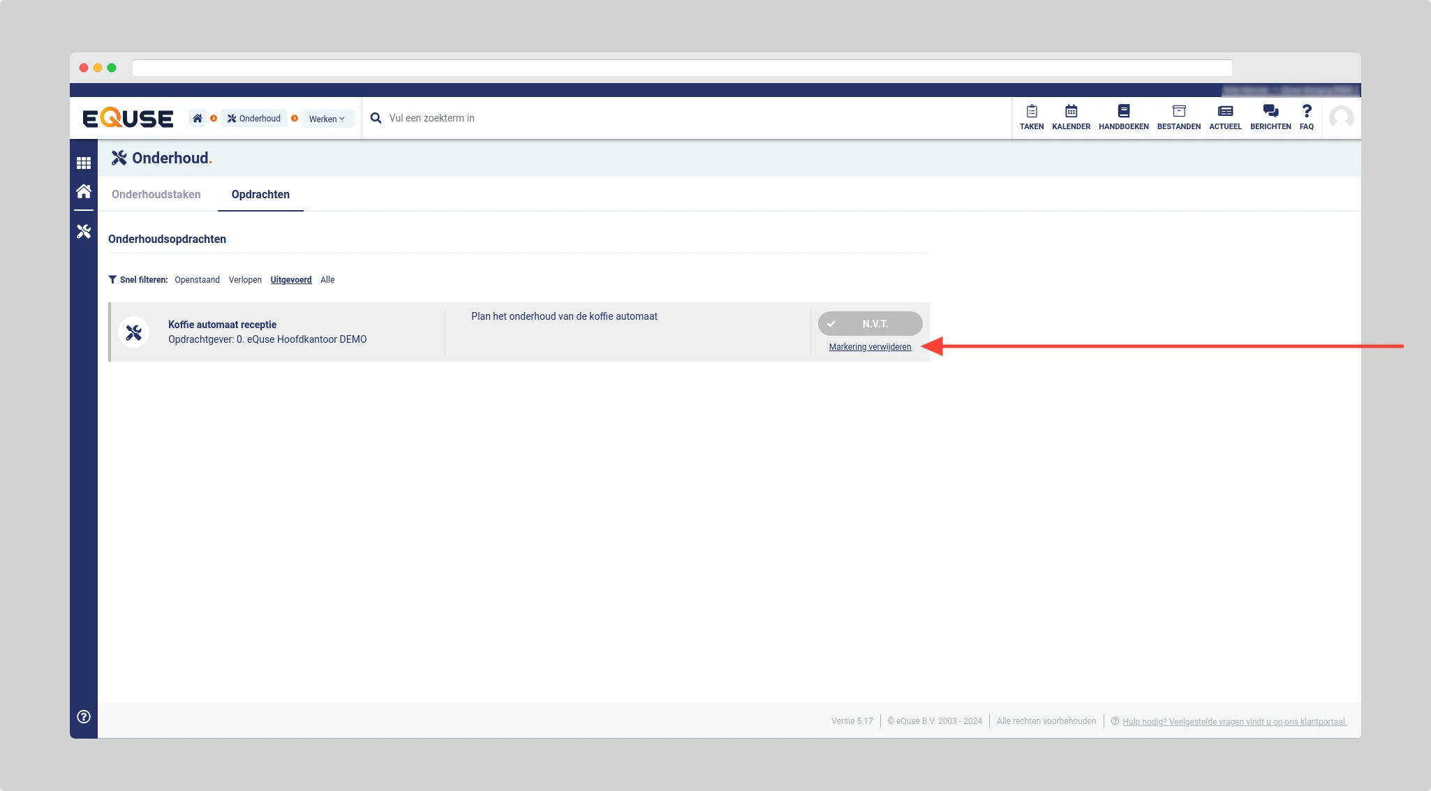 Wanneer u een onderhoudsopdracht wilt uitvoeren die u eerder als niet van toepassing heeft gemarkeerd, dan heeft u de mogelijkheid deze markering te verwijderen zodat u deze (alsnog) kunt uitvoeren. Klik hiervoor direct onder de knop n.v.t. op de link markering verwijderen en bevestig uw keuze.