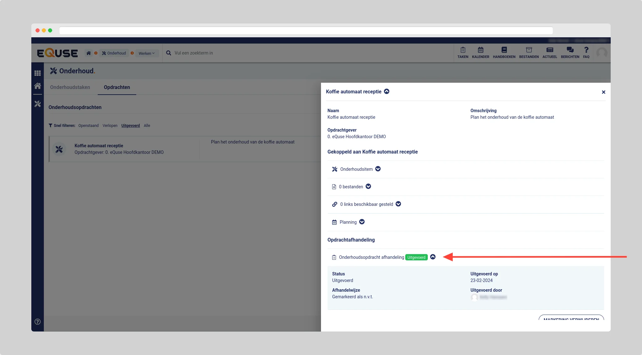 Klik in het overzicht van onderhoudsopdrachten op de opdracht waarvoor u de opdrachtafhandeling (uitvoering) wilt bekijken. Klik vervolgens onderaan in het zijpaneel, bij opdrachtafhandeling, op het pijltje om de afhandeling te bekijken.