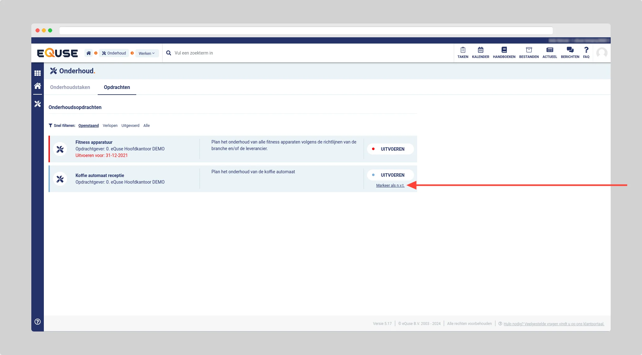 Afhankelijk van de instellingen bij de onderhoudsopdracht door de opdrachtgever, kan een onderhoudsopdracht door u als niet van toepassing gemarkeerd worden. Wanneer dit het geval is dan kunt u dit doen door direct onder de knop uitvoeren op de link markeer als n.v.t. te klikken en uw keuze te bevestigen.