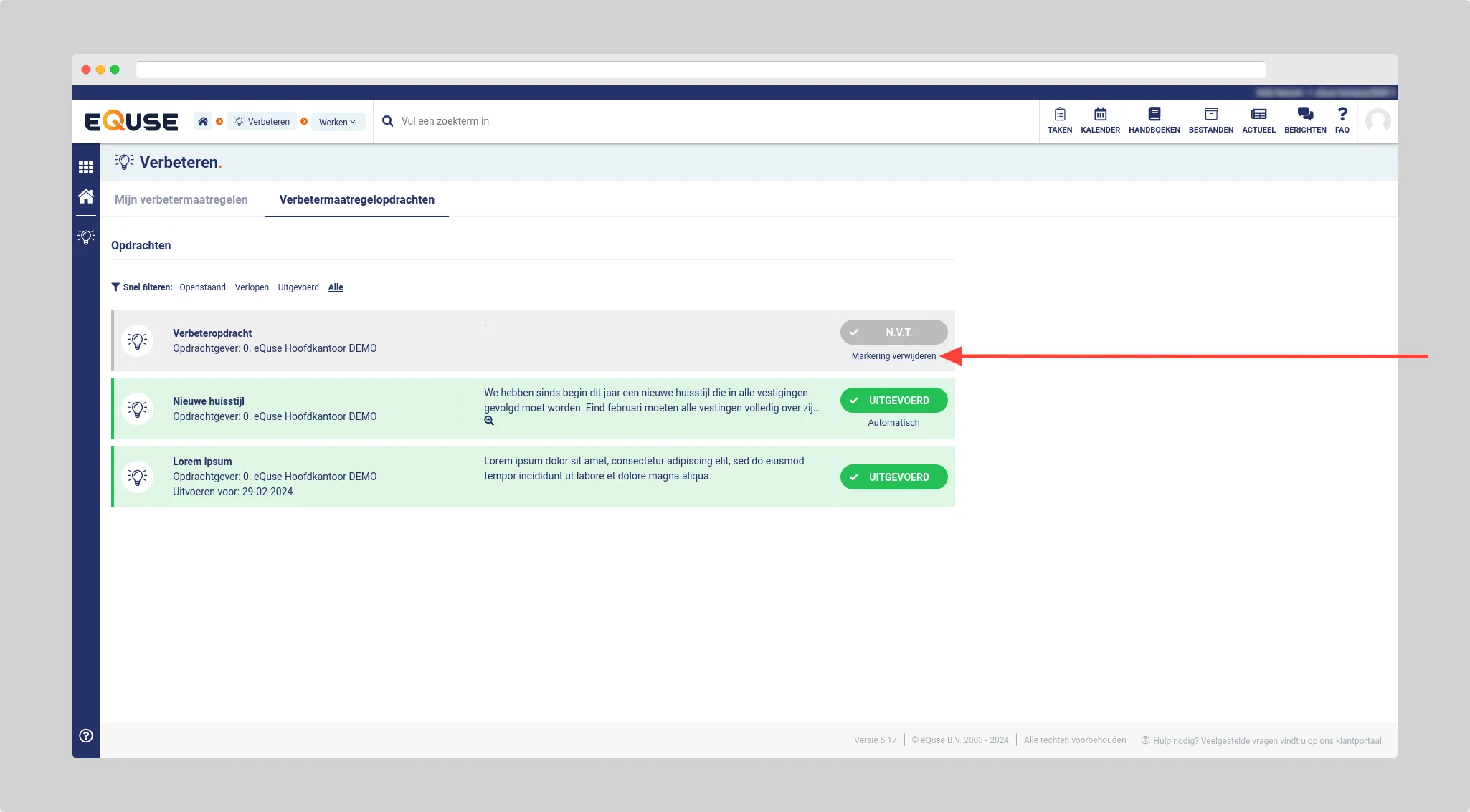 Wanneer u een verbetermaatregelopdracht wilt uitvoeren die u eerder als niet van toepassing heeft gemarkeerd, dan heeft u de mogelijkheid deze markering te verwijderen zodat u deze (alsnog) kunt uitvoeren. Klik hiervoor direct onder de knop n.v.t. op de link markering verwijderen en bevestig uw keuze.