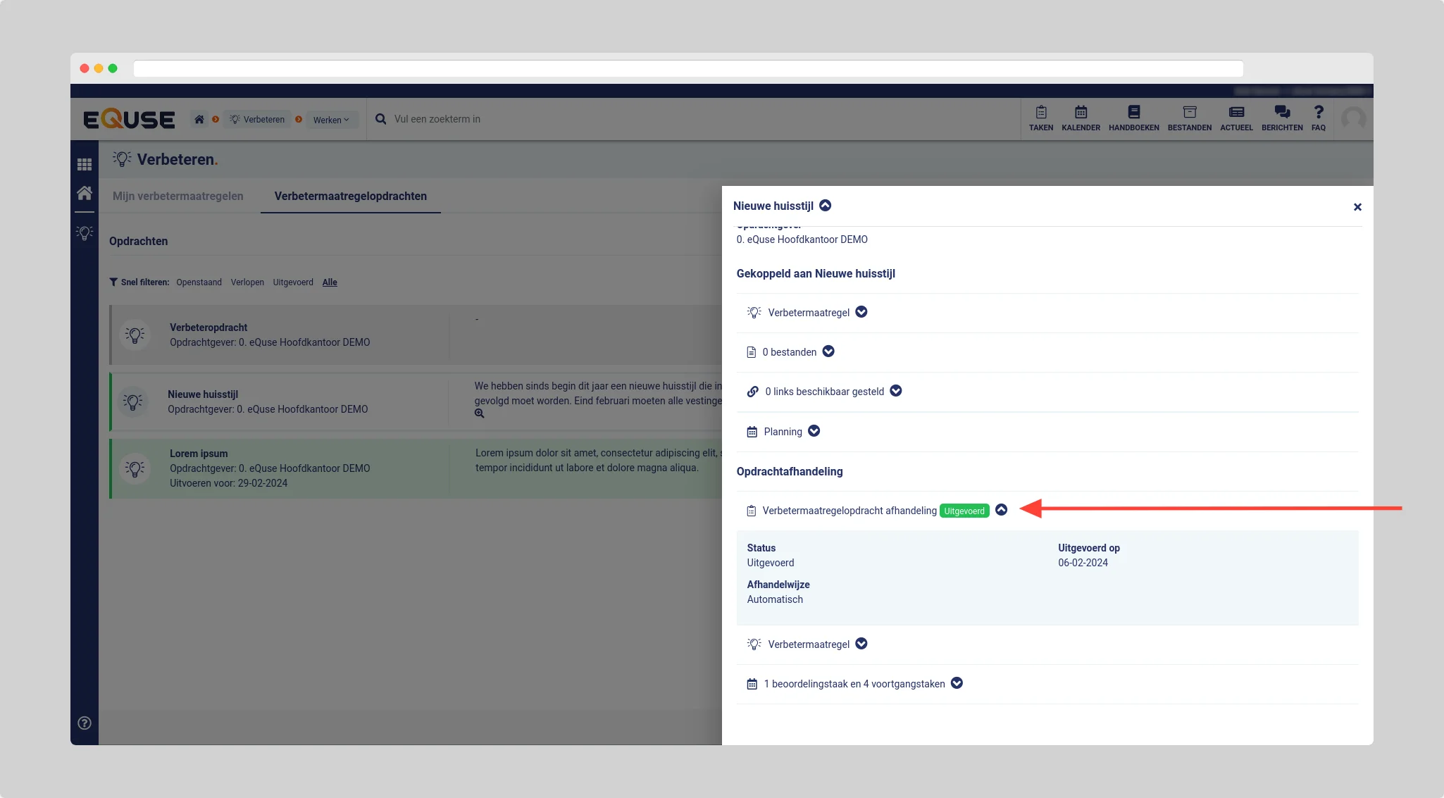 Klik in het overzicht van verbetermaatregelopdrachten op de opdracht waarvoor u de opdrachtafhandeling (uitvoering) wilt bekijken. Klik vervolgens onderaan in het zijpaneel, bij opdrachtafhandeling, op het pijltje om de afhandeling te bekijken.