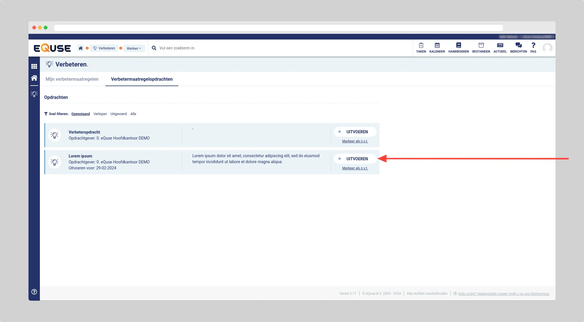Ga naar Verbeteren > Werken > Verbetermaatregelopdrachten en klik in het overzicht met openstaande verbetermaatregelopdrachten, bij de verbetermaatregelopdracht die u uit wilt voeren, op de knop uitvoeren.