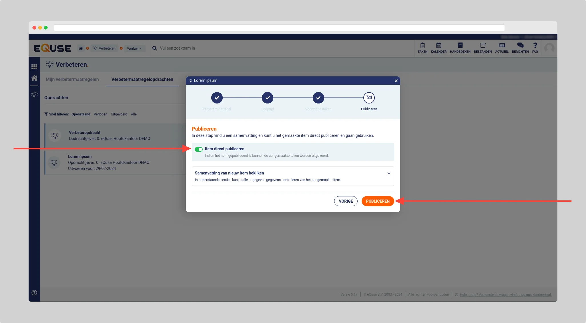 De verbetermaatregel zal pas zichtbaar worden in uw systeem als u deze in de laatste stap heeft gepubliceerd. Dit kunt u doen door de optie item direct publiceren te activeren en daarna op de knop publiceren te klikken.