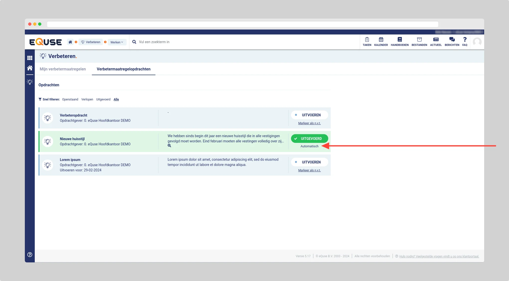 Wanneer een verbetermaatregelopdracht automatisch is uitgevoerd dan zal dit worden weergegeven door middel van het woord automatisch direct onder de status.