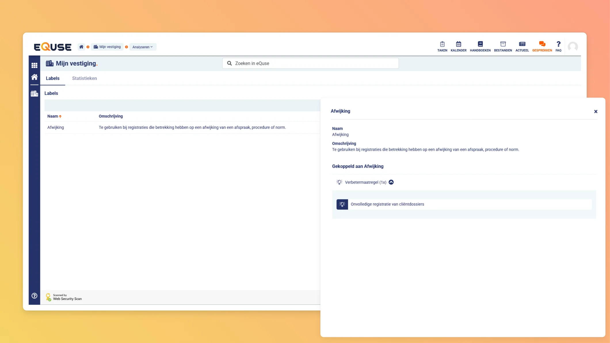 Labels ondersteunen u bij het organiseren van informatie, het sneller terugvinden van registraties en het analyseren van trends. Doordat labels in meerdere modules toepasbaar zijn, kunt u verbanden leggen tussen uiteenlopende onderdelen binnen eQuse.