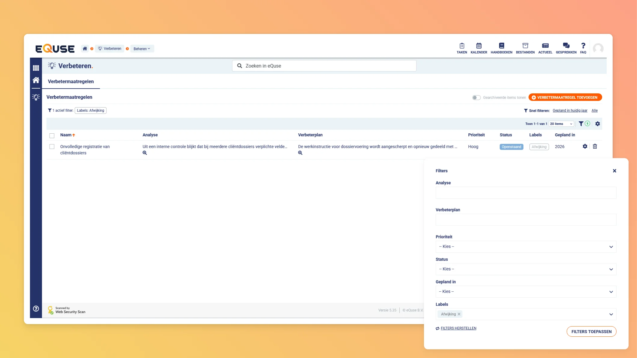 Heeft u vragen over het inrichten van labels binnen uw organisatie? Neem dan gerust contact op met onze helpdesk via support@equse.nl. Wij denken graag met u mee over een structuur die aansluit bij uw processen.