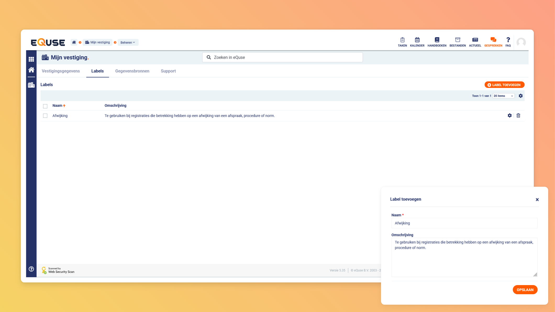Binnen eQuse kunt u labels gebruiken om gegevens te categoriseren en samenhang te creëren tussen verschillende onderdelen van uw organisatie. Een label bestaat uit een naam en een omschrijving en is vrij in te richten naar uw eigen proces.
