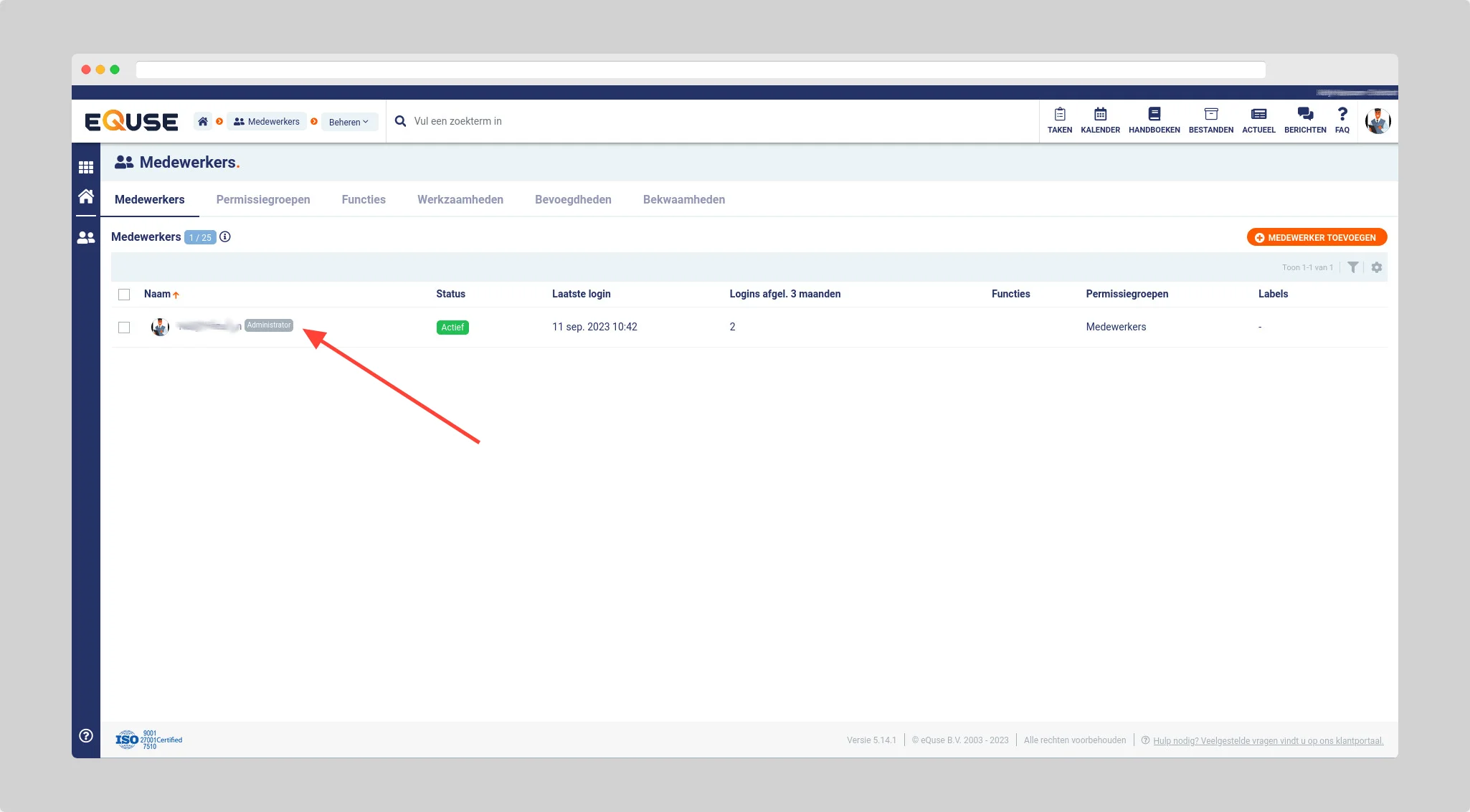 Een medewerker met Administrator permissies is eenvoudig te herkennen aan het "Administrator" label dat achter de naam van de medewerker zichtbaar is in het overzicht van medewerkers.