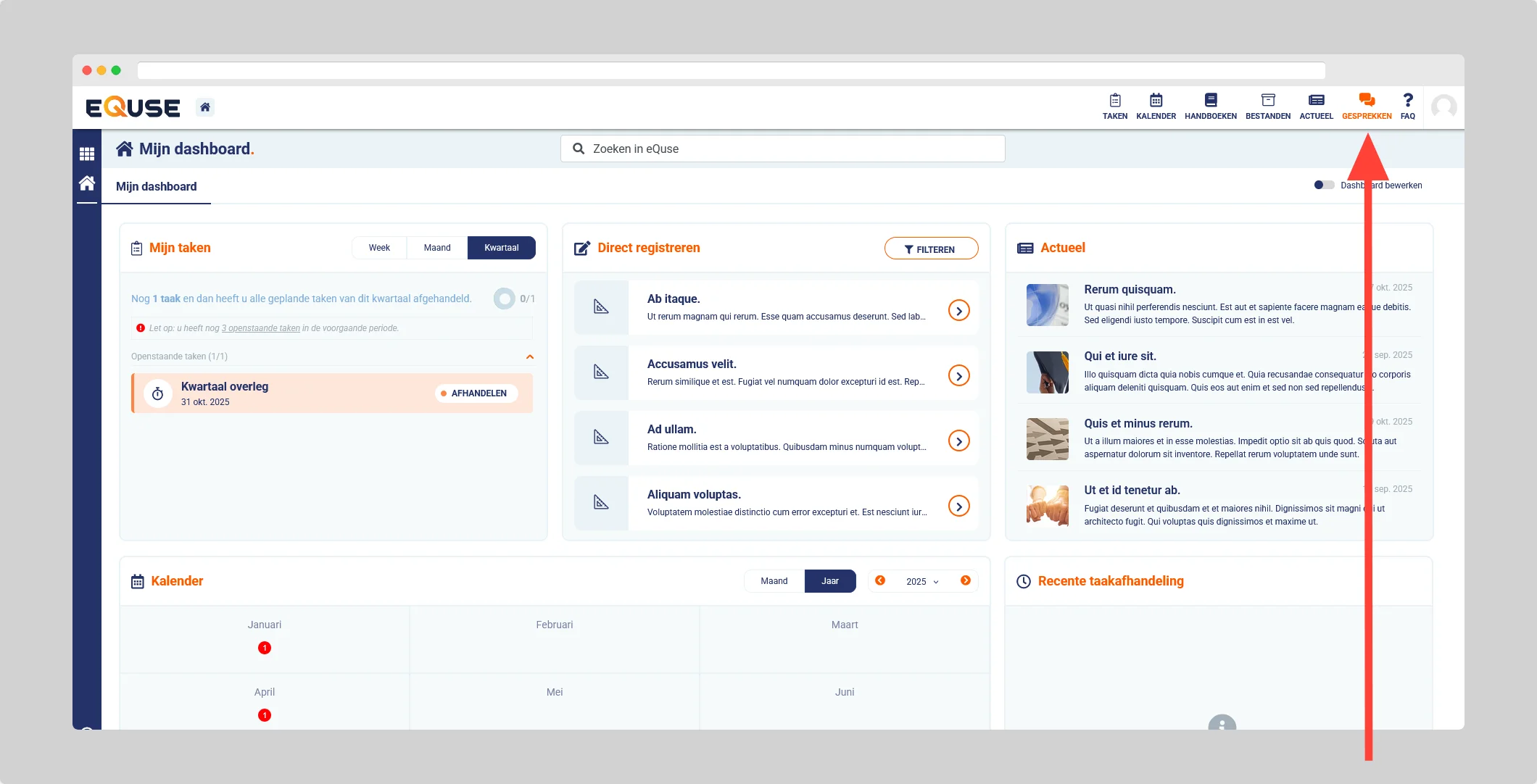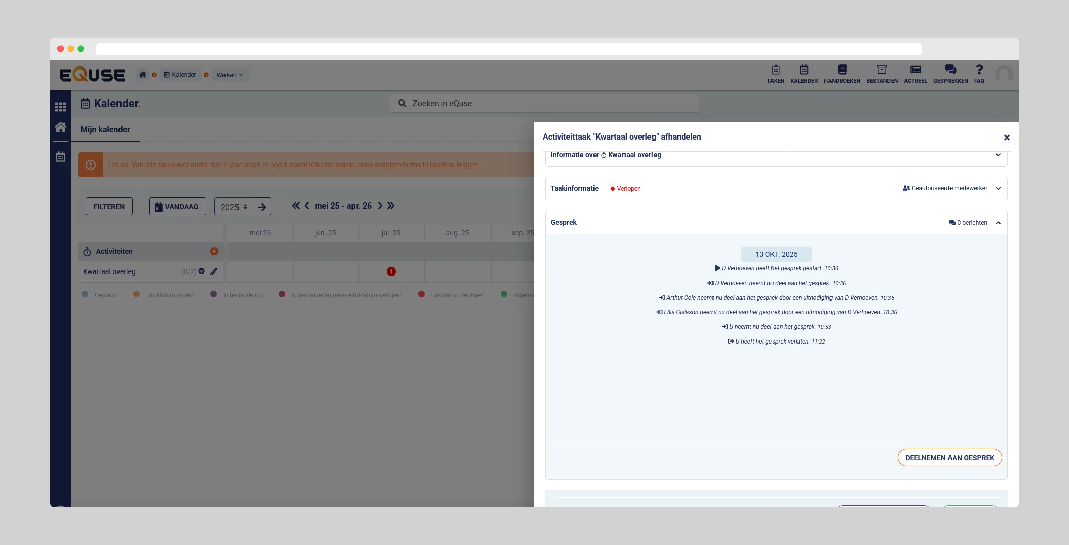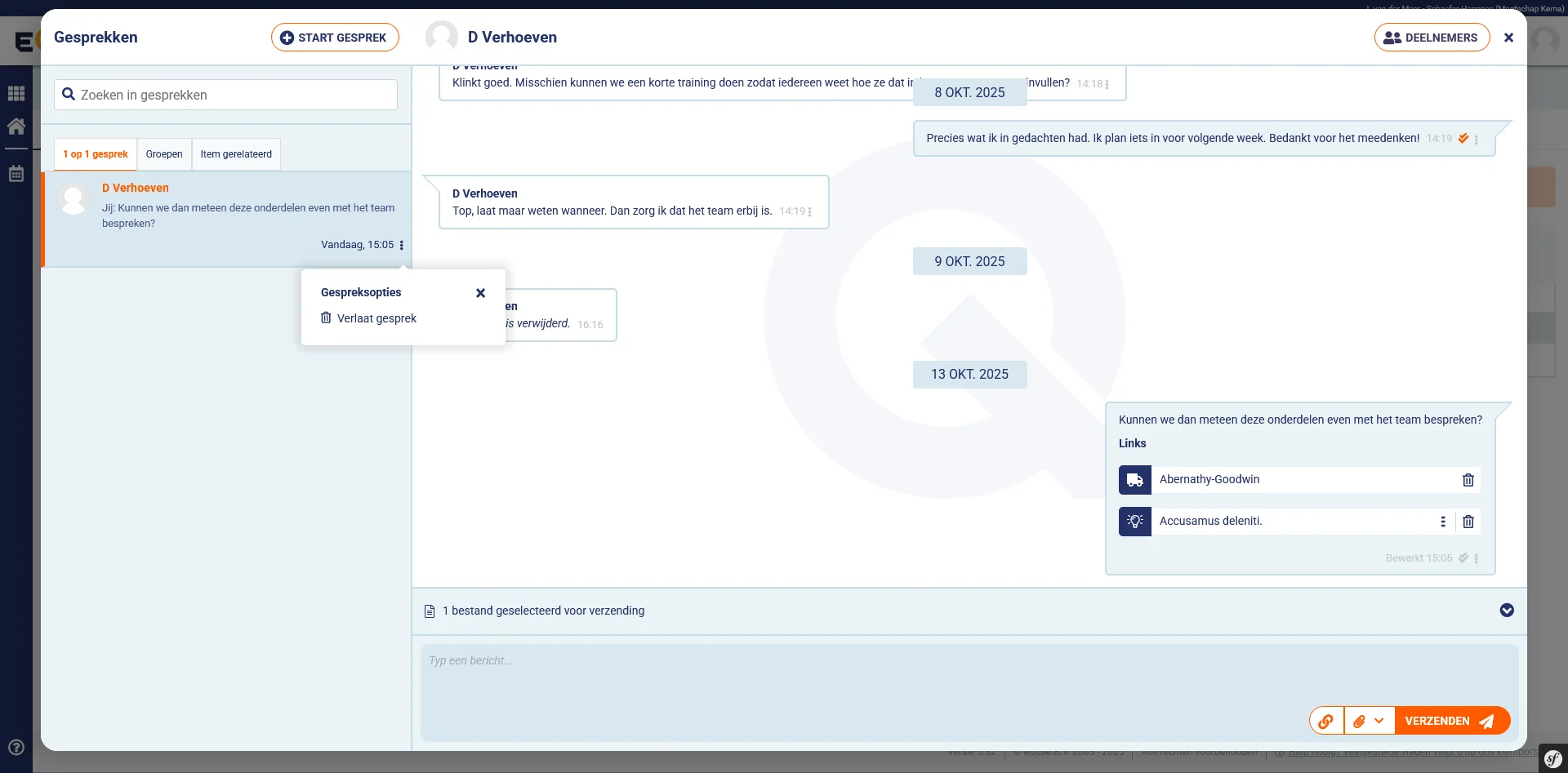 Met de functionaliteit Gesprekken kunt u binnen eQuse direct communiceren met collega’s — zonder e-mails of externe chatprogramma’s. Alle gesprekken vinden plaats binnen de context van uw werkzaamheden, waardoor communicatie overzichtelijk, aantoonbaar en makkelijk terug te vinden is.