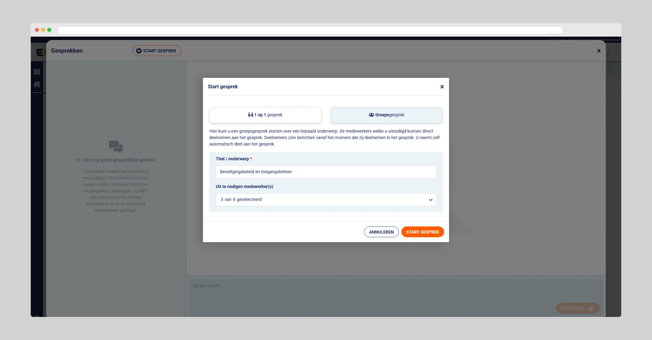 Groepsgesprekken zijn bedoeld voor samenwerking tussen meerdere collega’s. Denk aan het bespreken van procesverbeteringen of het verdelen van verantwoordelijkheden binnen een onderdeel. Iedere deelnemer ziet elkaars berichten, waardoor de communicatie transparant blijft en beslissingen goed te volgen zijn.