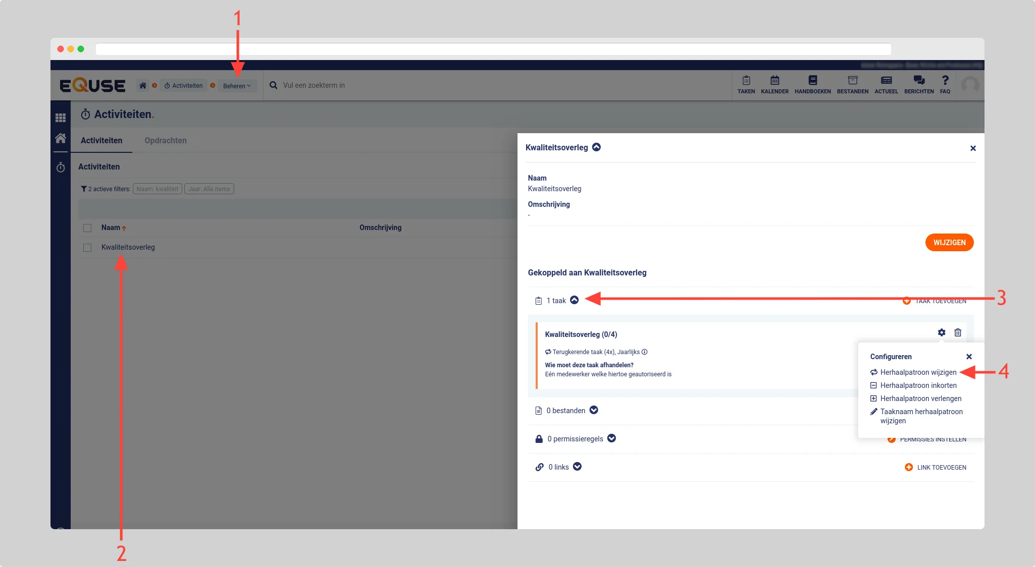 Volg onderstaande stappen om het patroon van herhalende taken aan te passen, op voorwaarde dat er nog geen van deze taken zijn afgerond. Voor geplande formulieren en opdrachten kan het patroon altijd worden gewijzigd. Houd er rekening mee dat als taken hierdoor worden verwijderd, ook de items die bij het afhandelen van de taak of het uitvoeren van de opdracht horen, zullen worden verwijderd.