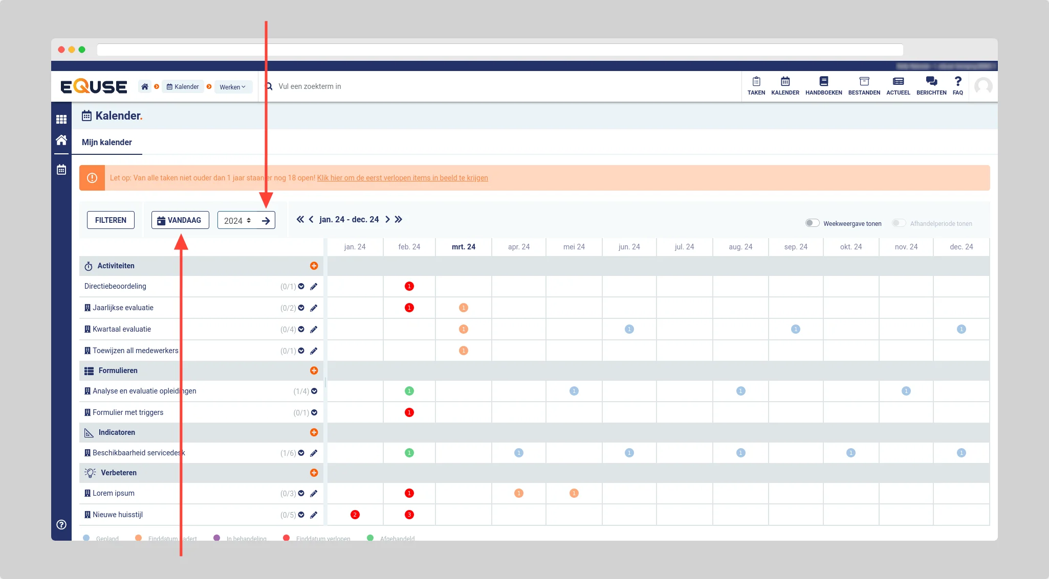 De kalender wordt standaard in een gecentreerde weergave weergegeven (de huidige maand staat in het midden van de kalender). Als u het (huidige) kalenderjaar wilt bekijken (januari tot en met december) dan kunt u dat doen door bovenaan de kalender op het pijltje naast het jaartal te klikken.