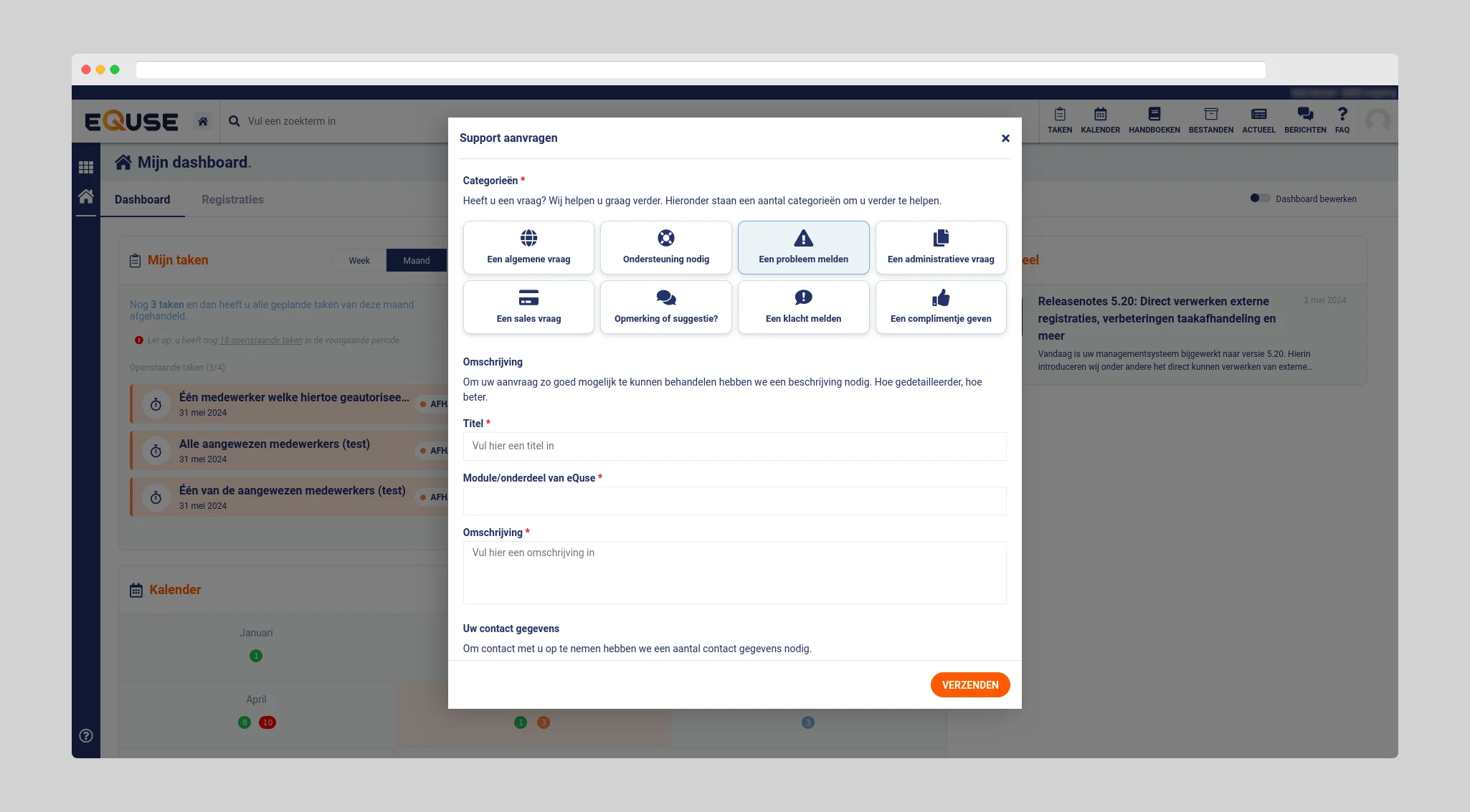 Indien het systeem een foutmelding toont dan kunt u contact opnemen met de helpdesk door het supportformulier te openen. Selecteer bij categorie de optie een probleem melden, geef aan bij welk onderdeel (module) in eQuse het probleem zich voordoet en geef een duidelijke omschrijving van de handelingen die u uitvoerde en overige relevante informatie.