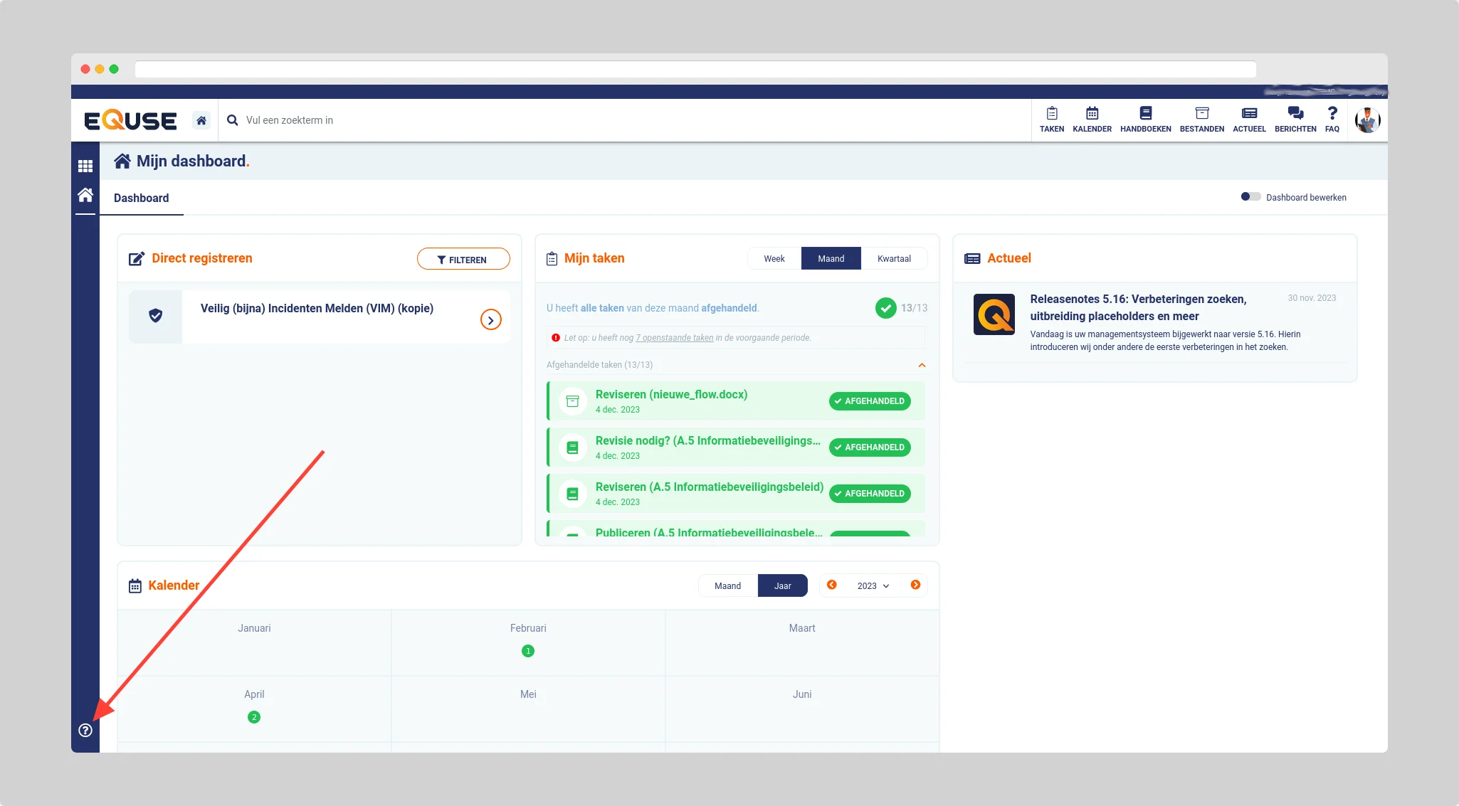 U kunt contact met de helpdesk opnemen door het support formulier te versturen. U kunt dit formulier vinden door links onderaan het systeem het vraagteken aan te klikken. U kunt in plaats daarvan ook ervoor kiezen om een e-mail te sturen naar: support@equse.nl.