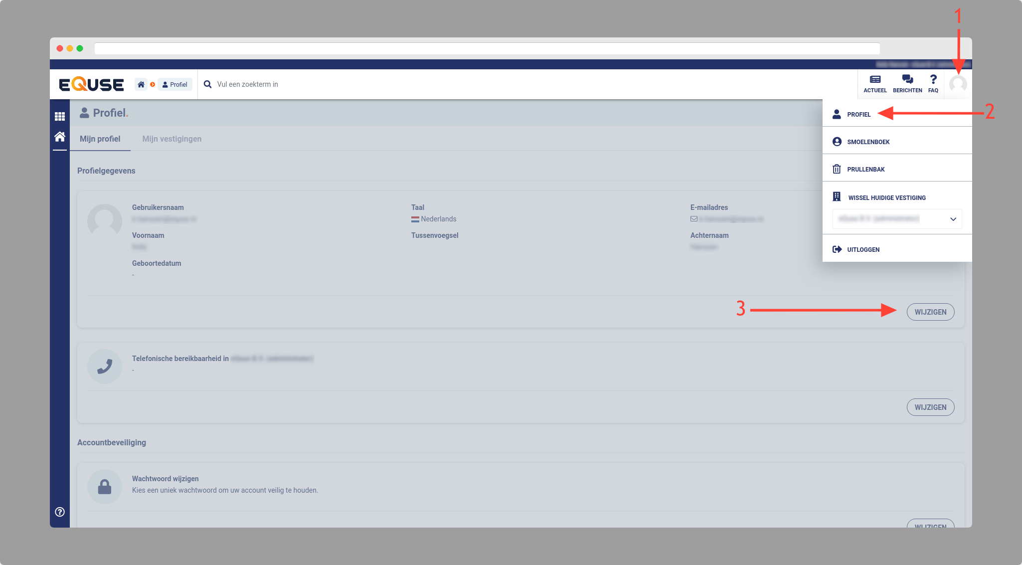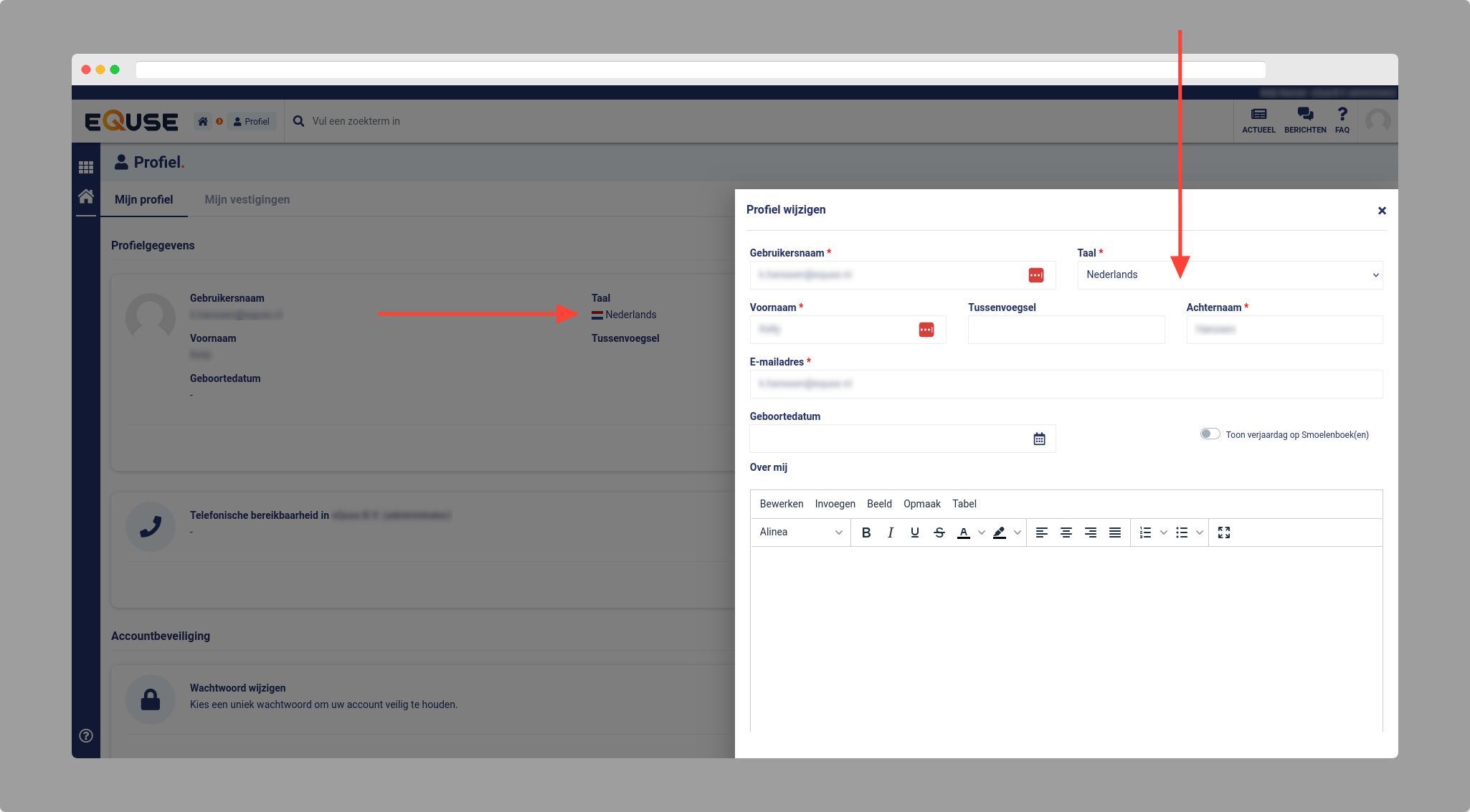 Het is mogelijk om eQuse5 in het Engels te gebruiken. U kunt in uw profiel de taal wijzigen die weergegeven wordt in de interface van het systeem. De inhoud van uw systeem zal nog steeds alleen in de ingevoerde taal beschikbaar zijn.
