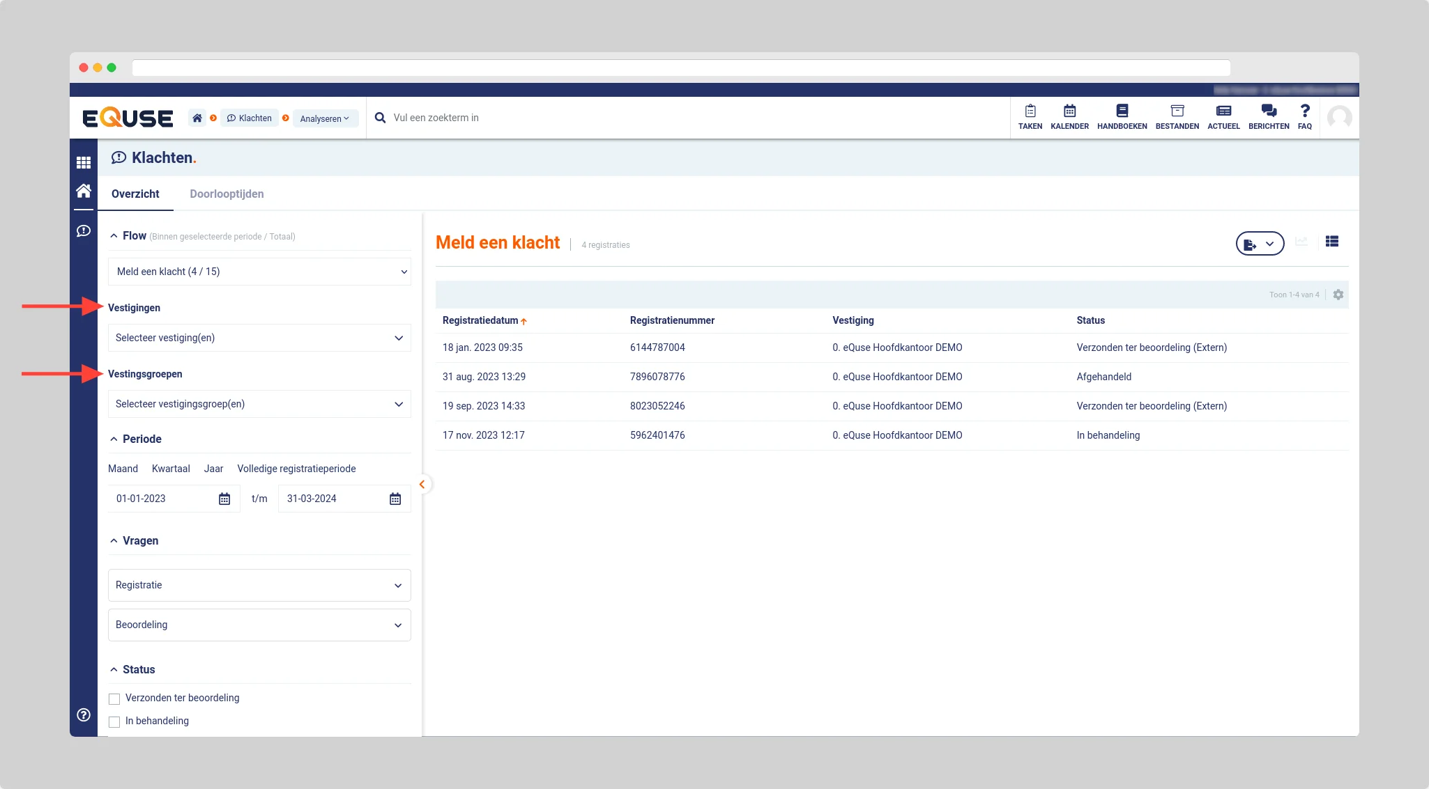U heeft de mogelijkheid om in de Analyseren omgeving van de verschillende formulieren modules de gegevens te filteren op specifieke vestigingen of specifieke vestigingsgroepen door deze te selecteren bij de filterinstellingen op de overzicht pagina.