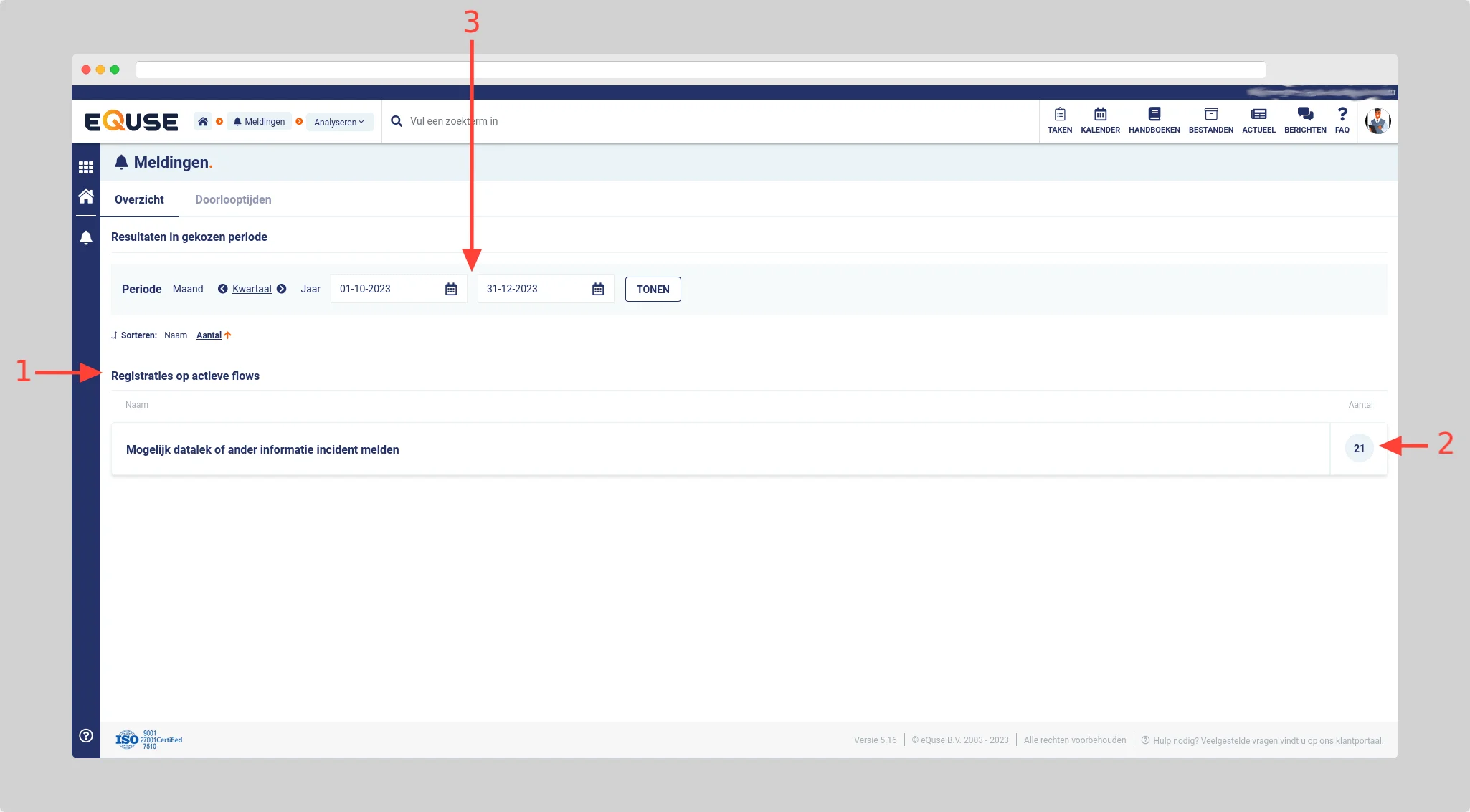 ⚠ Aandachtspunt: Standaard worden alleen de formulierflows getoond waar het afgelopen kwartaal op geregistreerd is. Pas zo nodig de periode aan wanneer er formulierflows (en/of registraties) ontbreken!