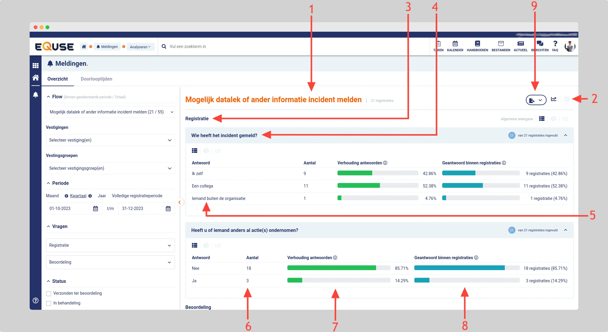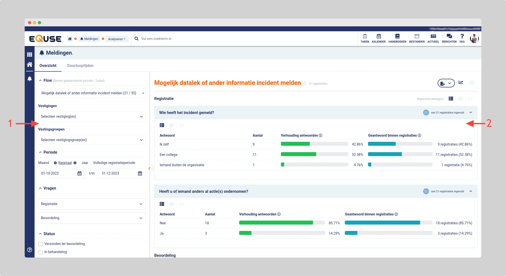 - Flow: De formulierflow (in dit voorbeeld zijn er op basis van de geselecteerde periode 21/55 registraties gevonden), en vanuit welke vestigingen of vestigingsgroepen de registraties zijn gedaan.