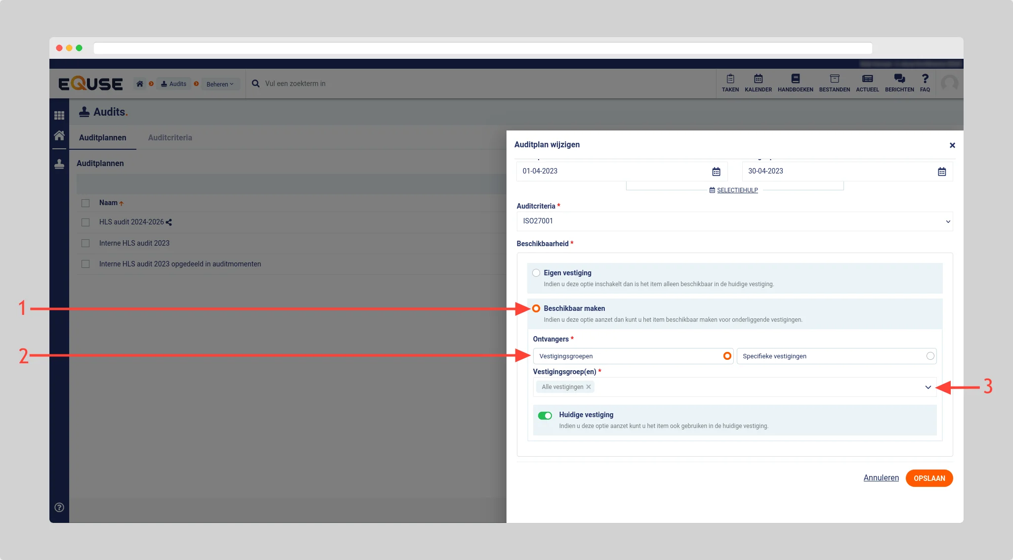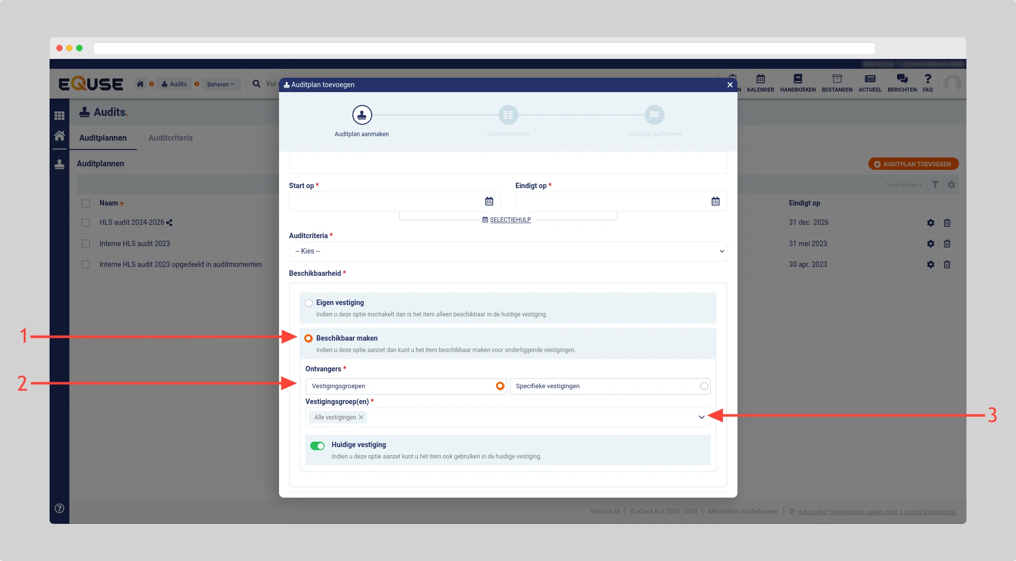 Vul de algemene gegevens in voor het nieuwe auditplan en selecteer bij Beschikbaarheid, de optie Beschikbaar maken om het auditplan beschikbaar te maken voor uw vestigingen (1). Vervolgens kunt u bij Ontvangers instellen of u het auditplan beschikbaar wilt maken voor vestigingsgroepen of voor specifieke vestigingen (2). Selecteer afhankelijk van deze keuze de vestigingsgroepen of vestigingen waarvoor u het auditplan beschikbaar wilt maken (3).