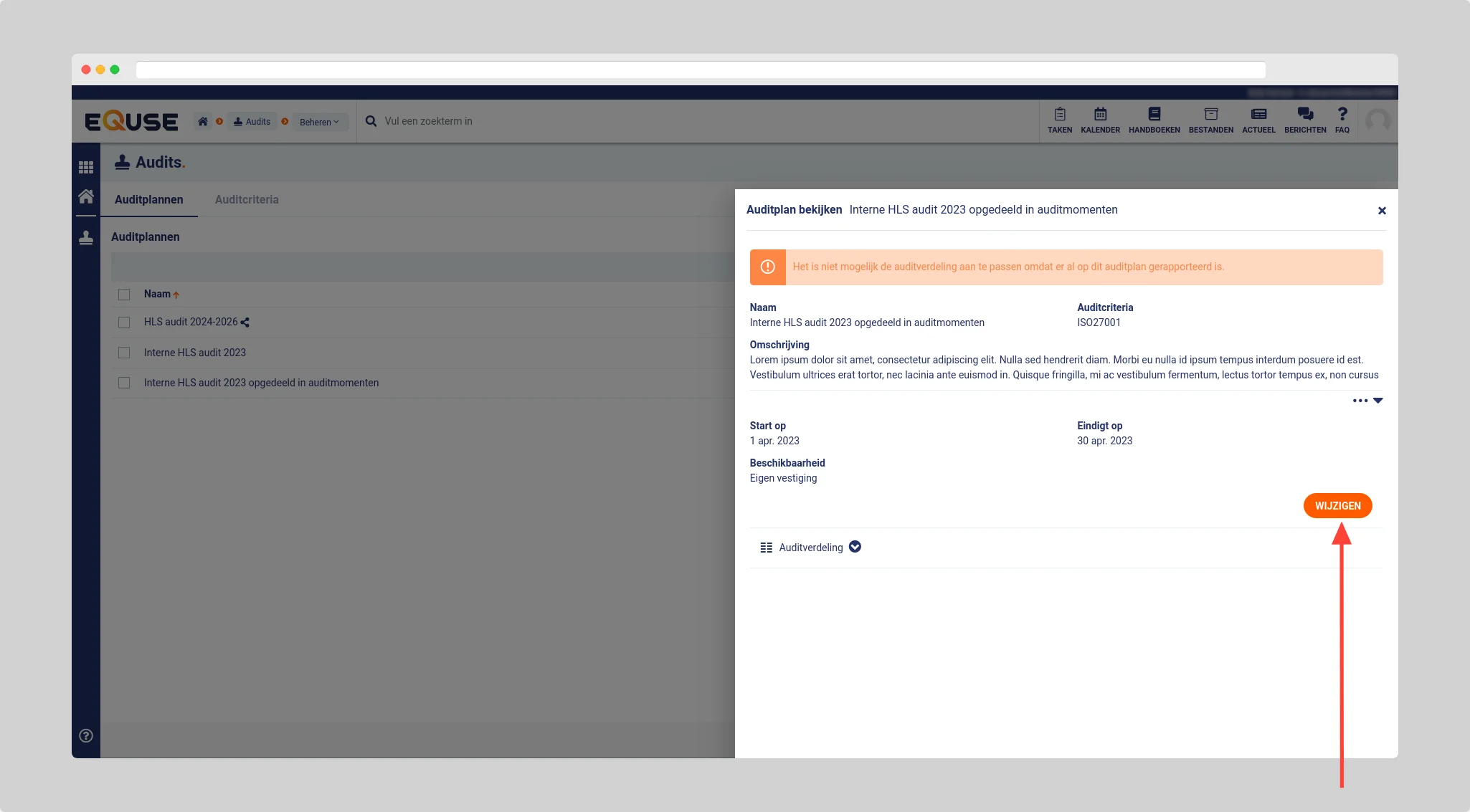U kunt een bestaand auditplan alsnog beschikbaar maken voor uw vestigingen. Ga hiervoor naar Audits > Beheren > Auditplannen, klik op de checklist die u beschikbaar wilt maken en klik vervolgens in het zijpaneel op de knop wijzigen.