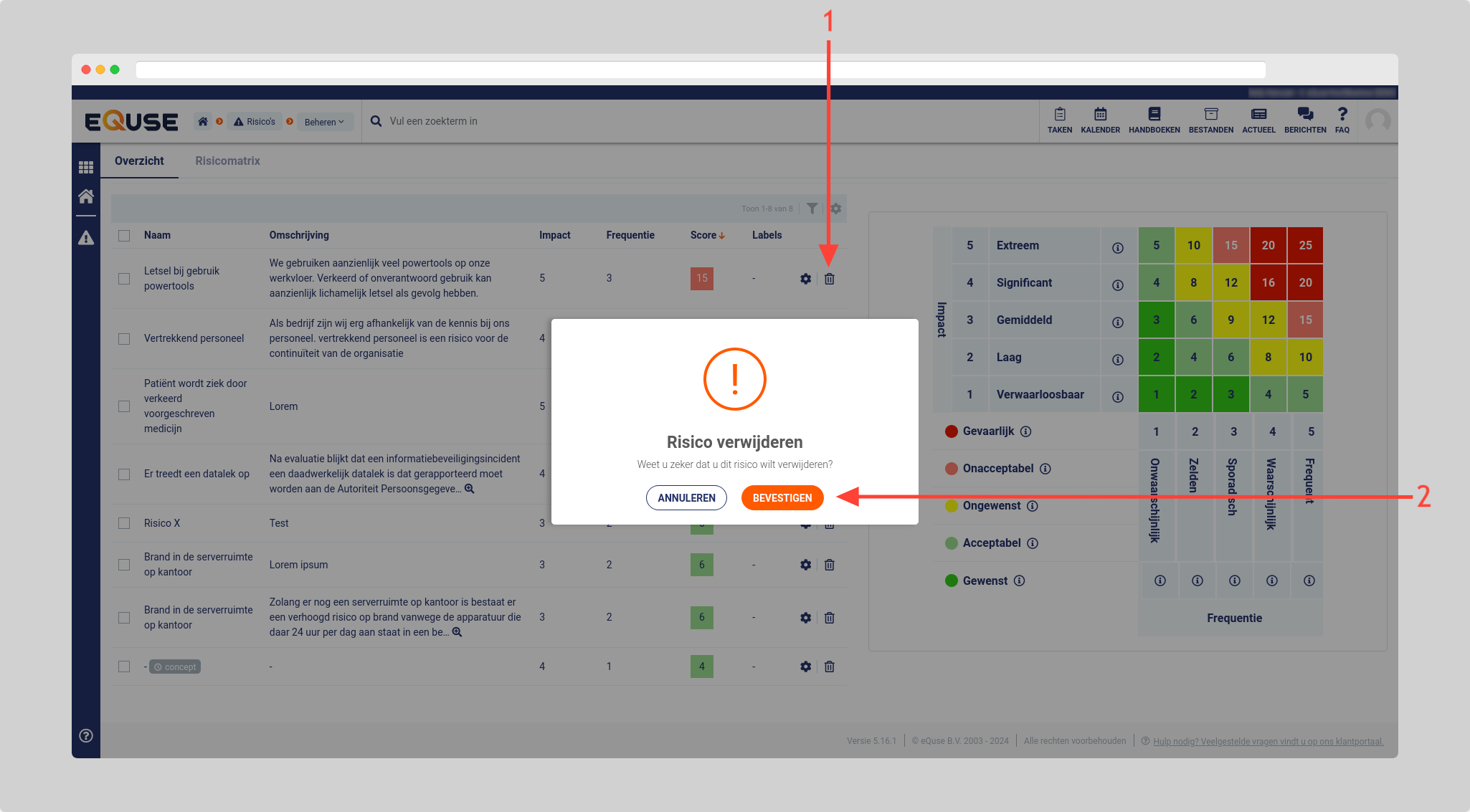 Ga naar Risico's > Beheren > Overzicht. Klik bij het risico dat u wilt verwijderen op het prullenbak icoon (1) en bevestig uw keuze (2).