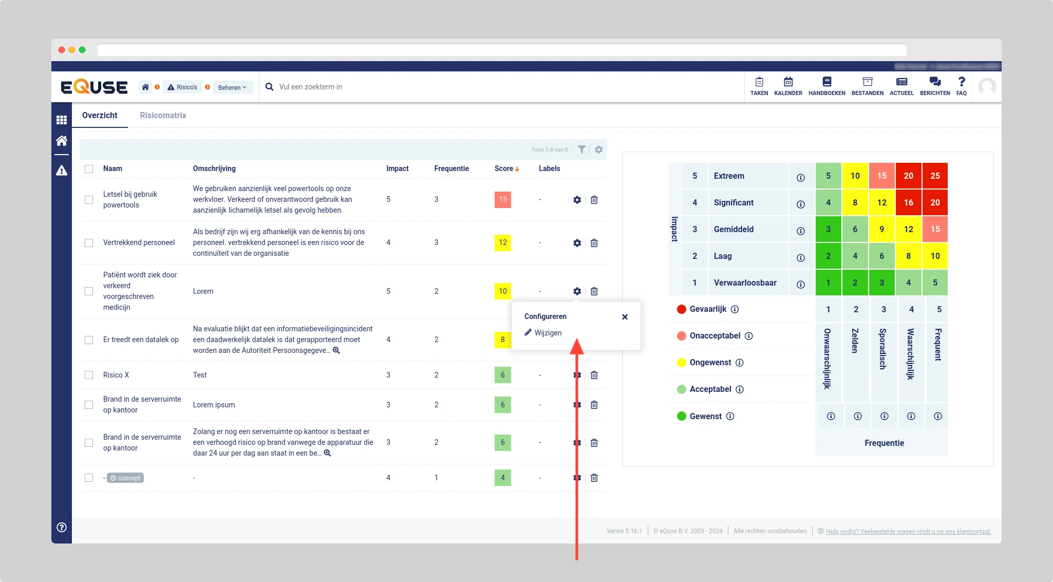 Ga naar Risico's > Beheren > Overzicht. Klik bij het risico dat u wilt wijzigen op het tandwiel icoon > wijzigen om het zijpaneel te openen.