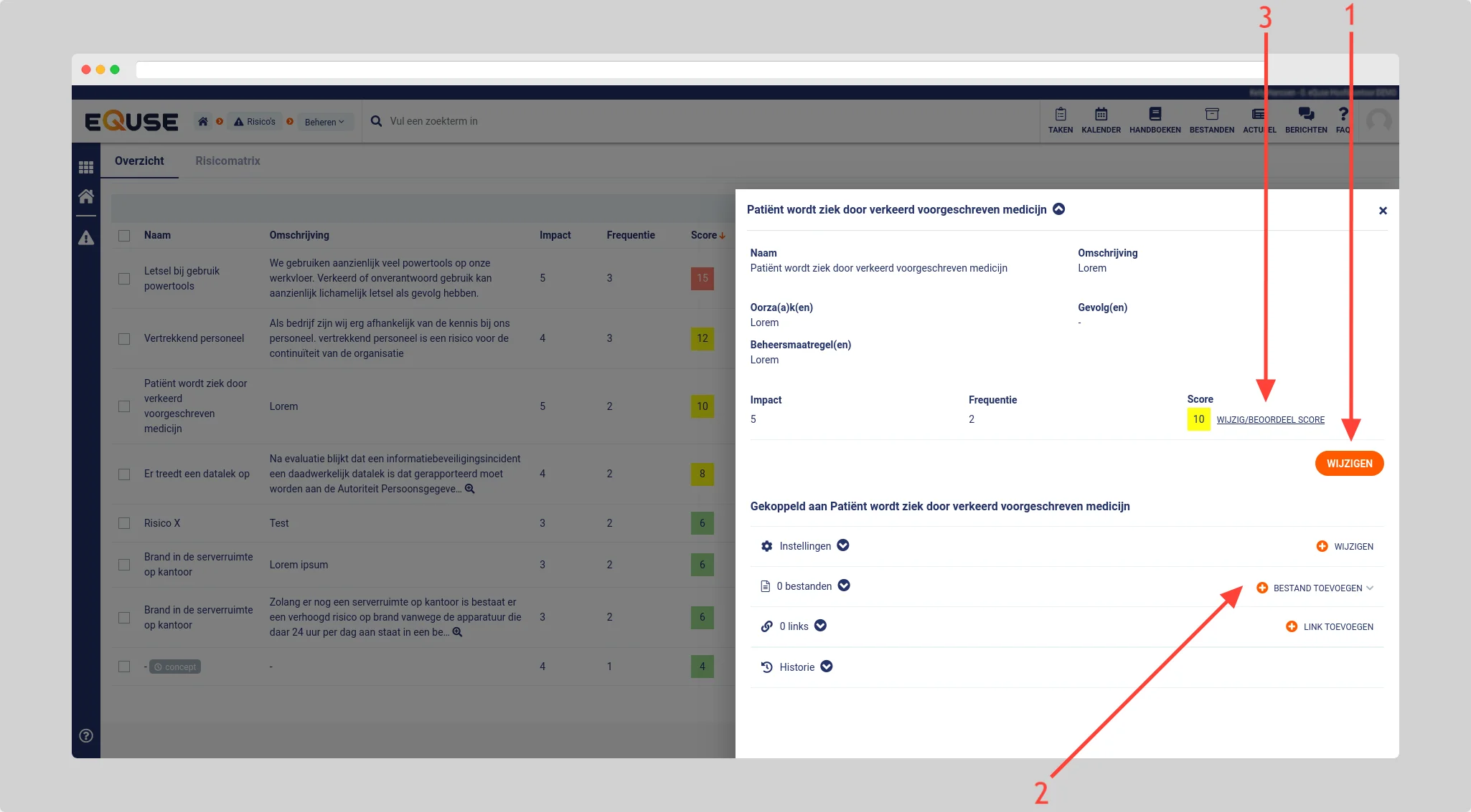 Klik op de knop wijzigen (1) om de risico configuratie te wijzigen. U heeft in het zijpaneel tevens de mogelijkheid om de instellingen, bestanden en links (2) en de beoordeel score (3) te wijzigen.