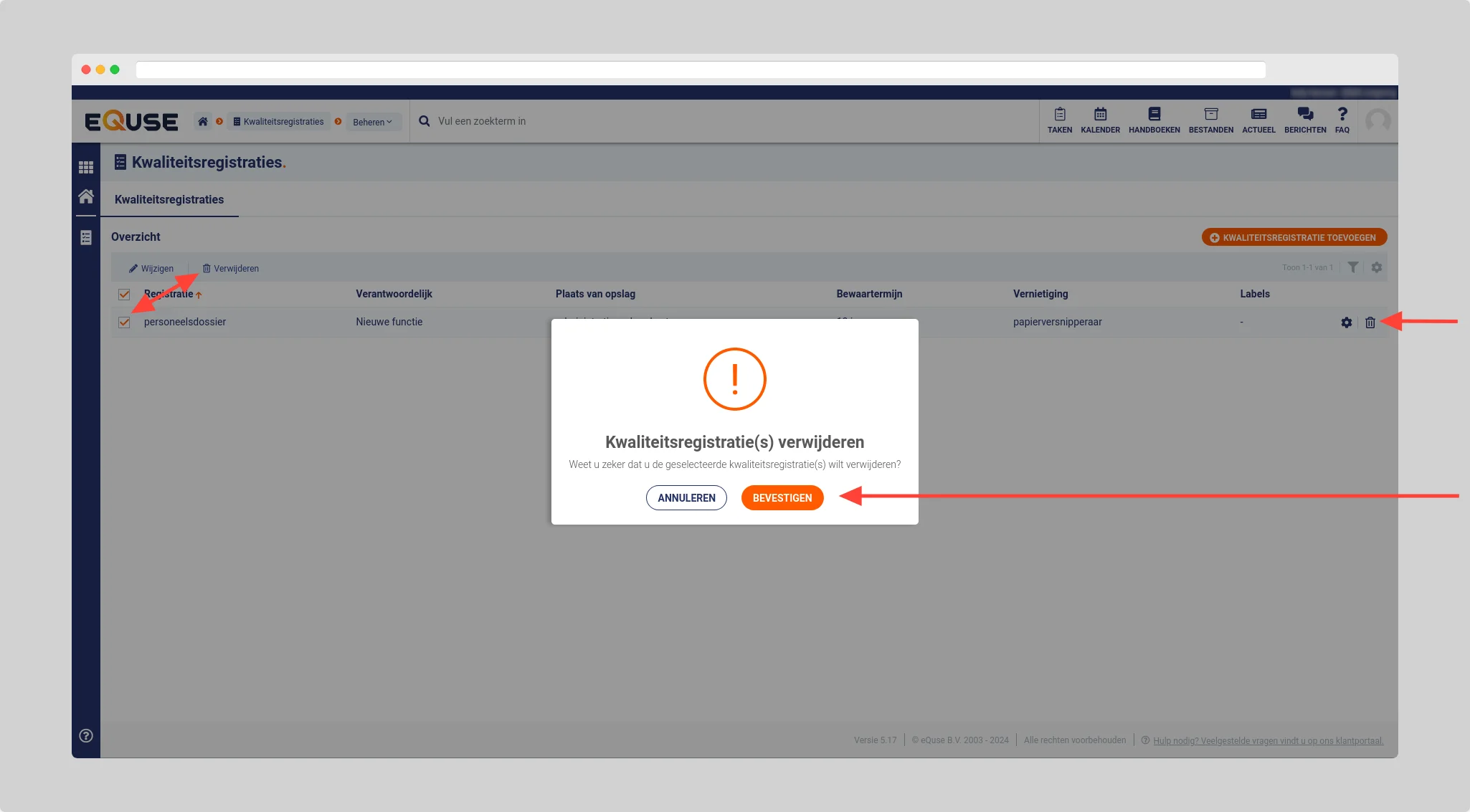 - Selecteer de kwaliteitsregistratie die u wilt verwijderen door het selectievakje aan te klikken en op verwijderen te klikken (of klik op het prullenbak icoontje).