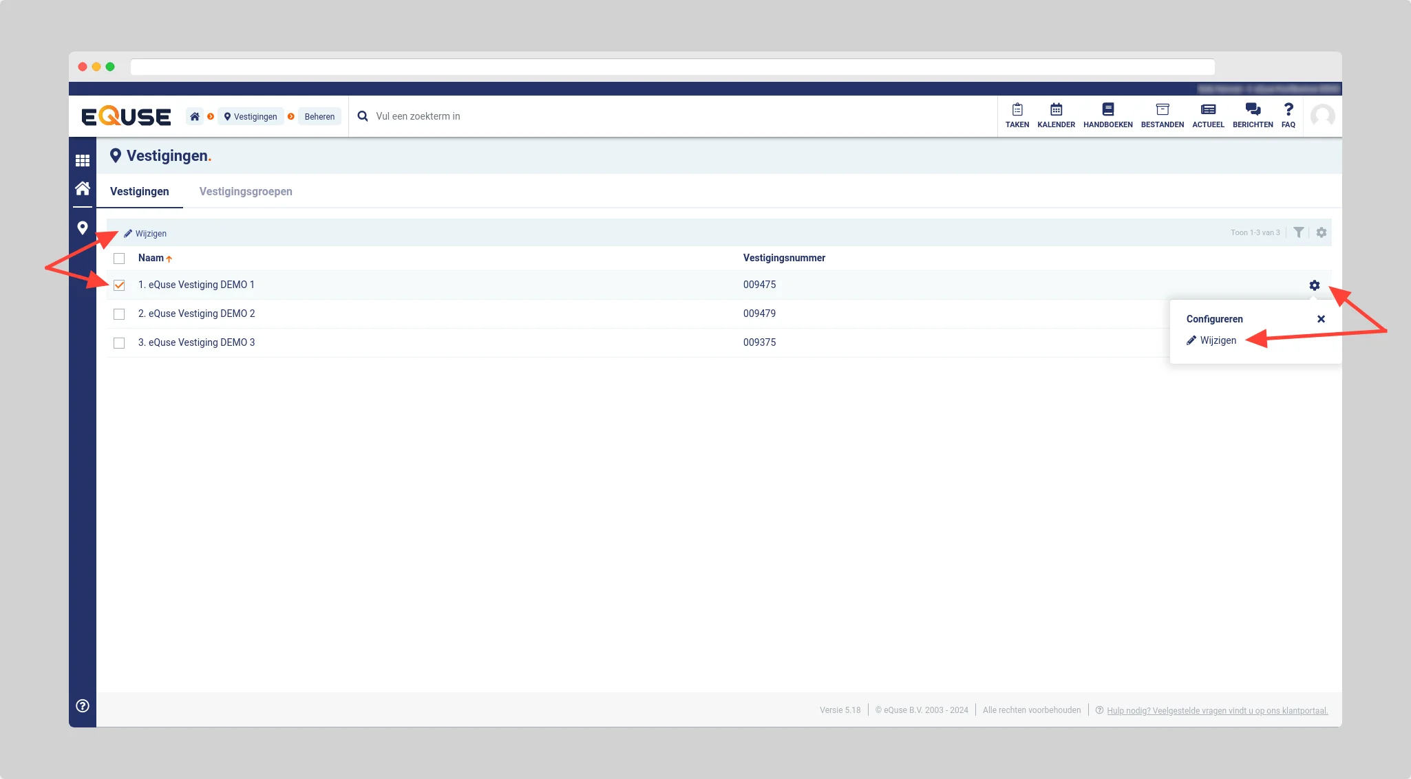 Selecteer de vestiging waarvoor u de naam of het vestigingsnummer wilt wijzigen door het selectievakje aan te klikken (of klik op het tandwiel icoon) en klik vervolgens op wijzigen.