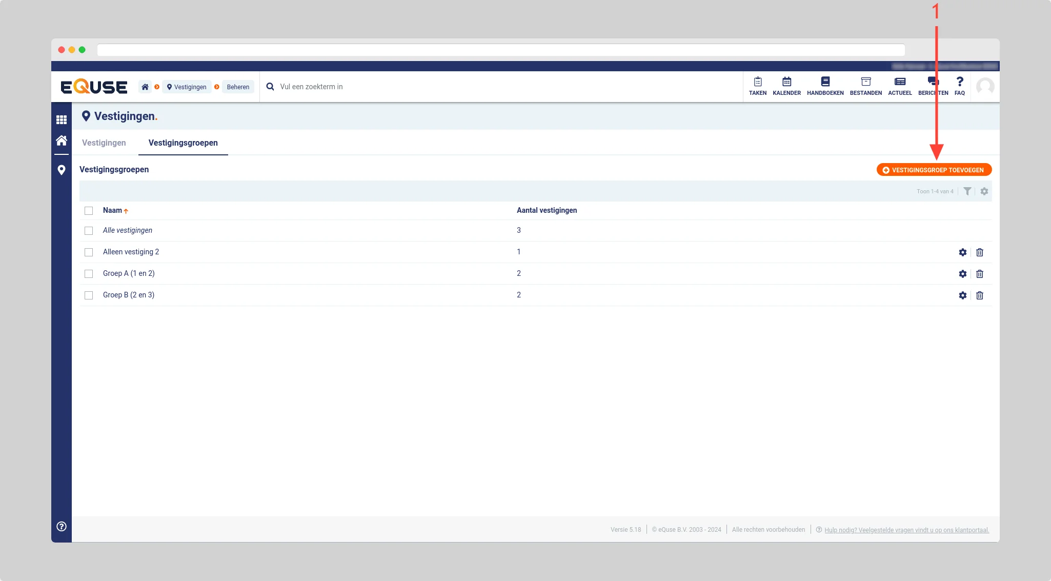 Om een nieuwe vestigingsgroep te te voegen, ga naar Vestigingen > Beheren > Vestigingsgroepen en klik op de knop vestigingsgroep toevoegen (1).