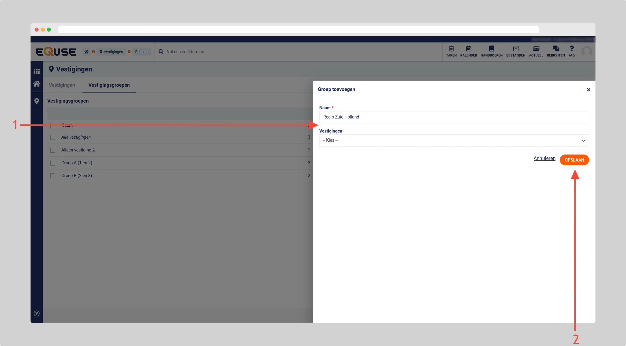 Vul vervolgens een naam in voor de nieuwe vestigingsgroep en selecteer de vestigingen die u aan de groep wilt toevoegen (1). Klik daarna op de knop opslaan (2) om de wijzigen op te slaan.