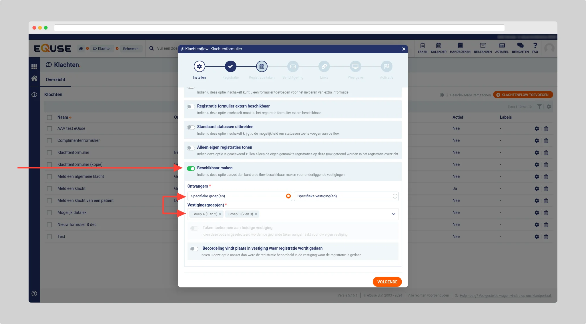 Klik in de stap instellingen op de optie beschikbaar maken en selecteer de ontvangers (vestigingsgroepen, of vestigingen). Selecteer vervolgens de specifieke vestigingsgroepen of vestigingen waar u de formulierflow beschikbaar voor wilt maken.