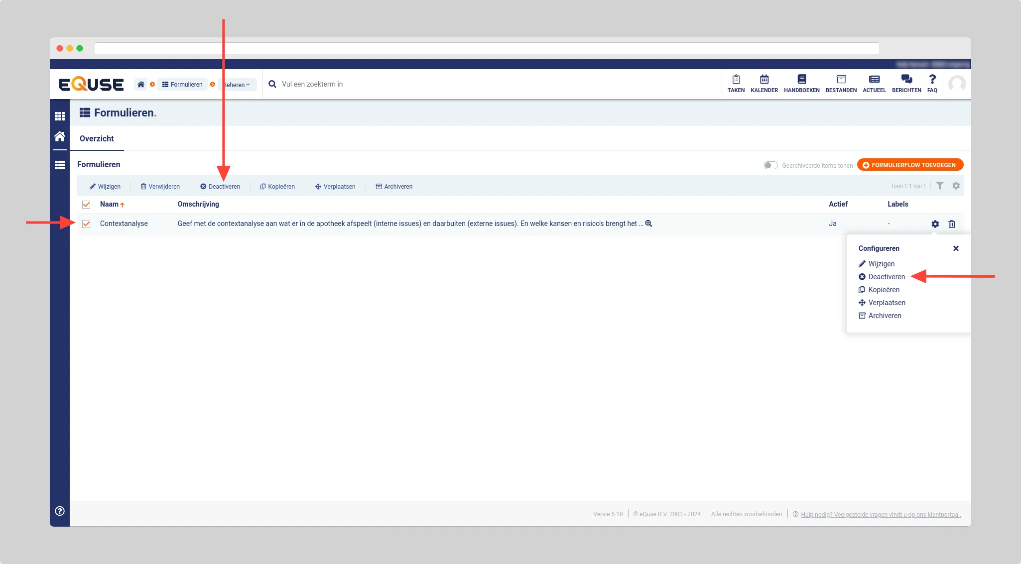Ga naar de Beheren omgeving van een formulieren module waar u de formulierflow heeft toegevoegd (Formulieren, Klachten, Meldingen, Incidenten, Huiselijk geweld of Calamiteiten) en klik op het selectievakje of tandwiel icoon bij de formulierflow die u wilt deactiveren, en klik daarna op deactiveren.