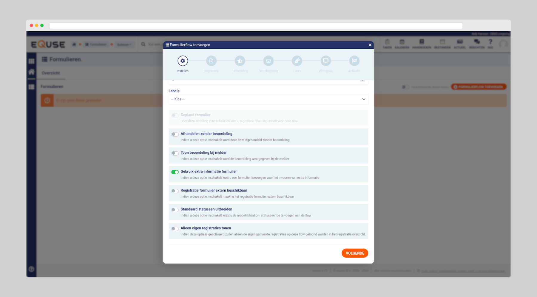 Indien u bij het toevoegen van een nieuwe formulierflow de optie gebruik extra informatie formulier activeert kunt u een formulier toevoegen voor het invoeren van extra informatie.