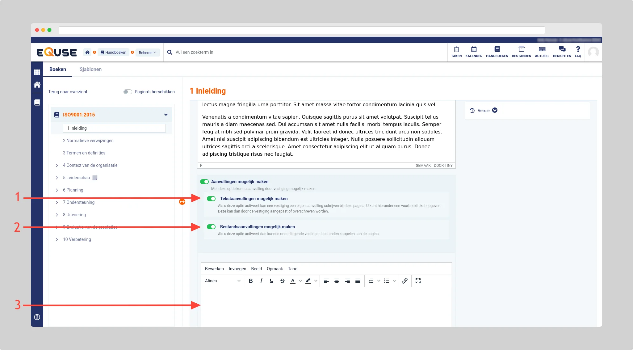 Wanneer u de optie tekstaanvullingen mogelijk maken (1) activeert dan kan een vestiging een eigen aanvulling schrijven bij de pagina. U kunt hierbij eventueel een voorbeeldtekst opgeven (3). Deze kan dan door de vestiging aangepast of overschreven worden.