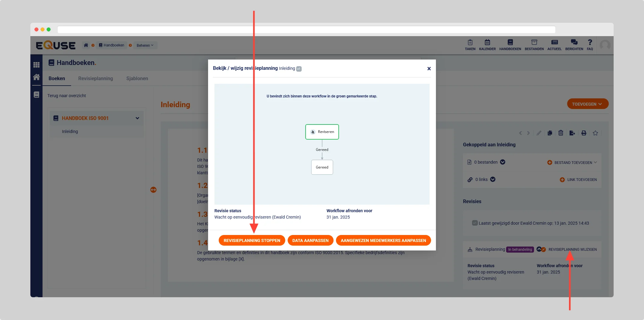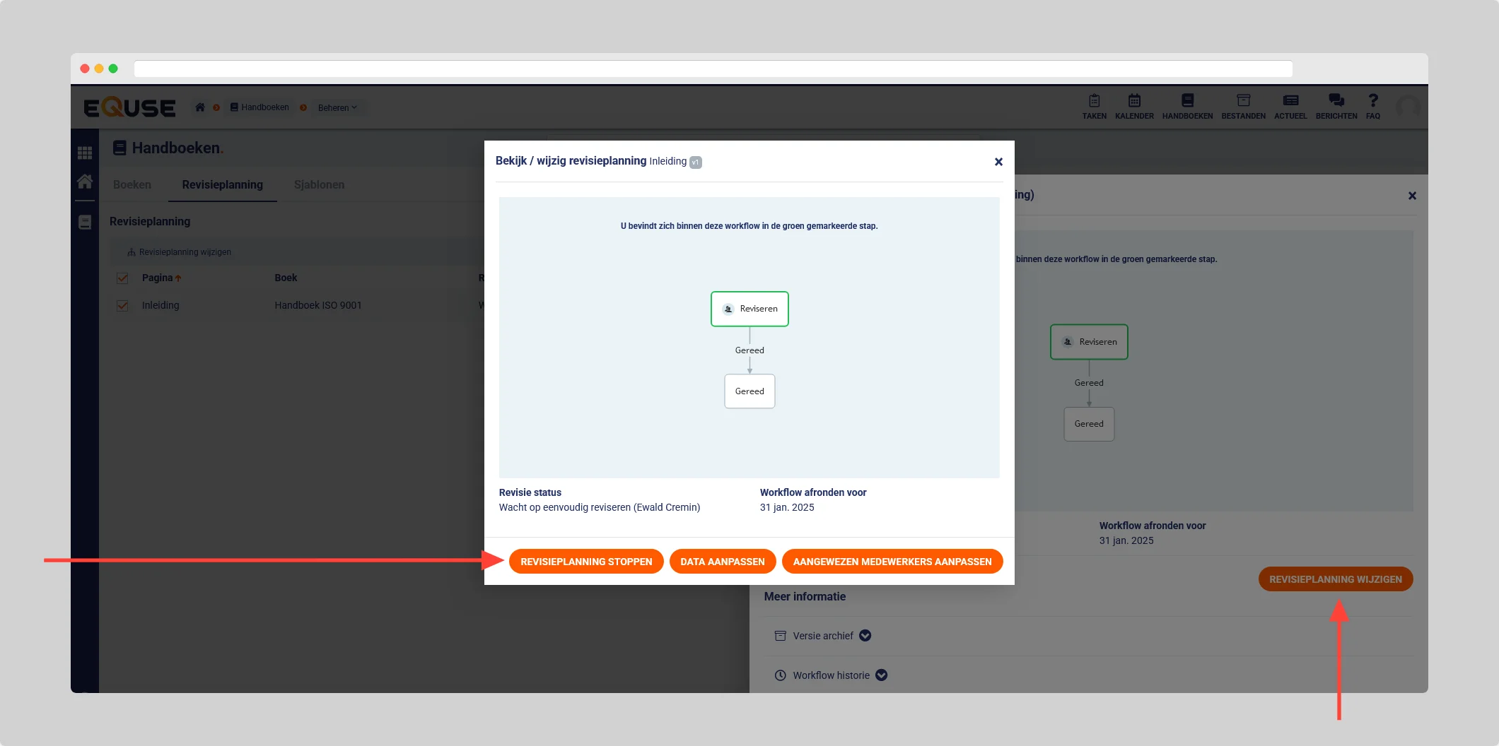 - Ga naar Handboeken > Beheren > Revisieplanning en selecteer de handboekpagina waarvoor u de revisieplanning wilt stopzetten door het selectievakje aan te klikken en op revisieplanning wijzigen te klikken.