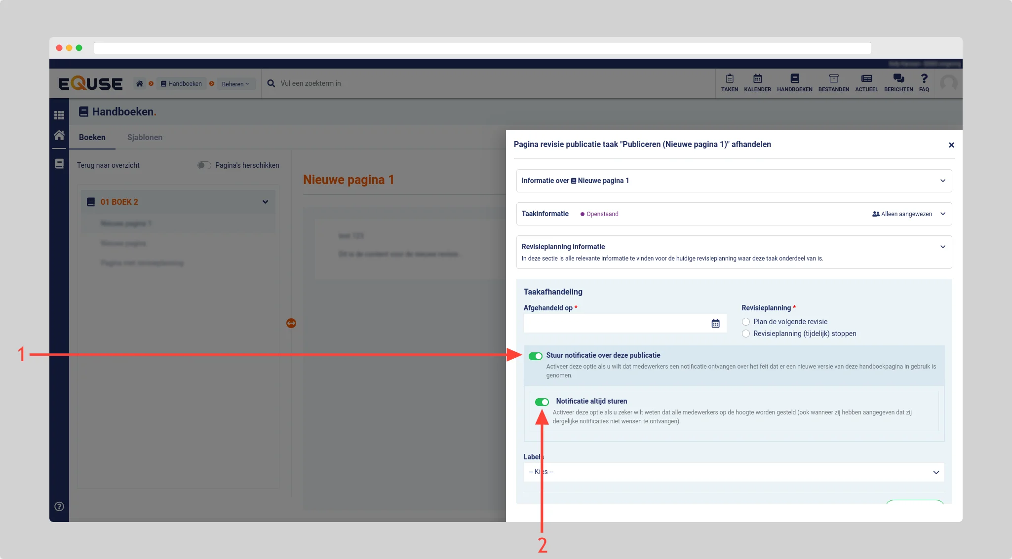 Bij de publicatie van een handboek pagina revisie, heeft u de mogelijkheid om medewerkers een notificatie te laten ontvangen over het feit dat er een nieuwe versie van deze pagina in gebruik is genomen (1). Als u zeker wilt weten dat alle medewerkers op de hoogte worden gesteld (ook wanneer zij hebben aangegeven dat zij dergelijke notificaties niet wensen te ontvangen), dan kunt u er voor kiezen om de notificatie altijd te sturen (2).