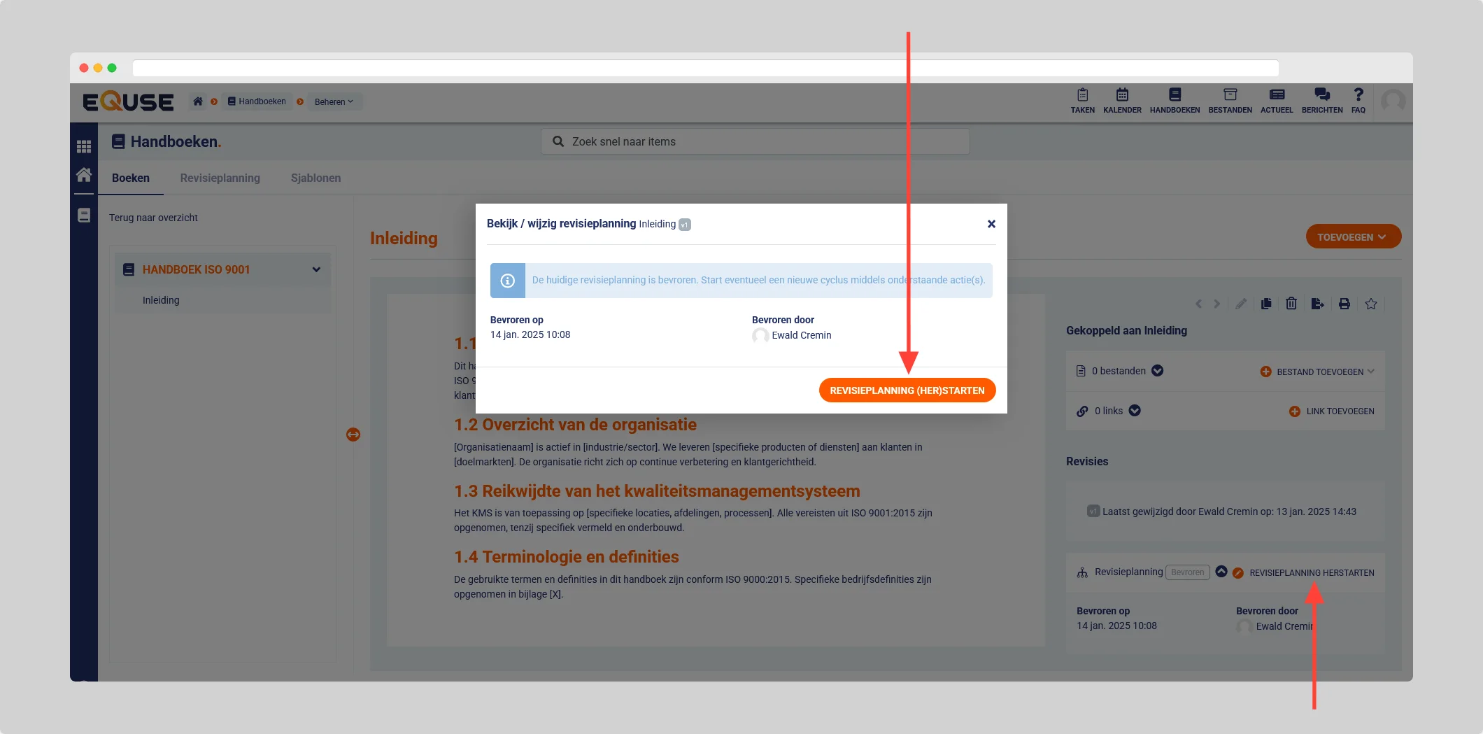 - Klik op de handboekpagina waarvoor u de revisieplanning wilt herstarten.