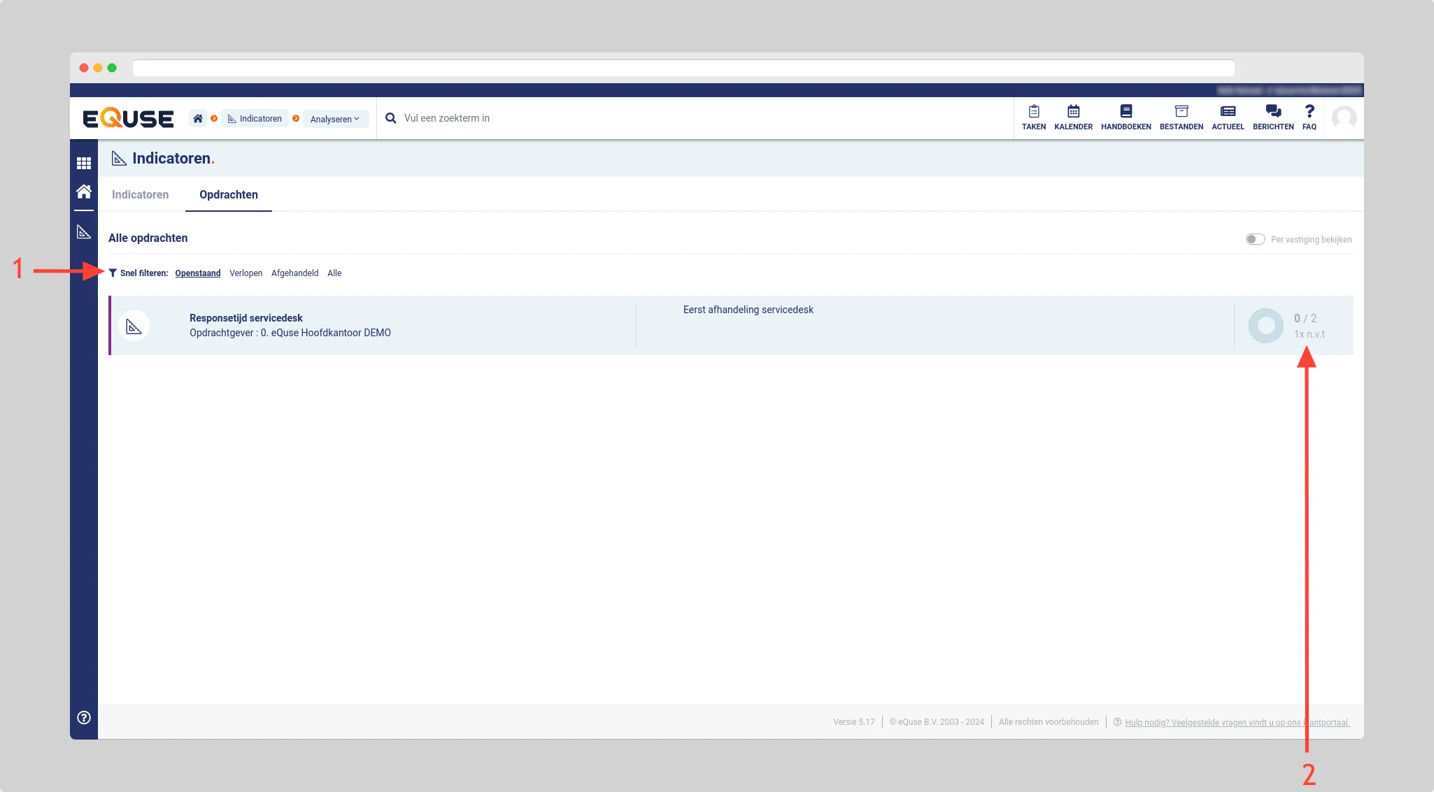 Via Indicatoren > Analyseren > Opdrachten kunt u zien welke vestigingen de indicatoropdrachten hebben uitgevoerd of dit nog moeten doen. Met de snelfilter instellingen (1) kunt u het overzicht filteren op openstaande, verlopen, afgehandelde of alle indicatoropdrachten. Ook ziet u hier direct hoeveel vestigingen (groen) van het totaal aantal vestigingen waaraan de opdracht is toegewezen, deze reeds hebben uitgevoerd (2) of als niet van toepassing hebben gemarkeerd.