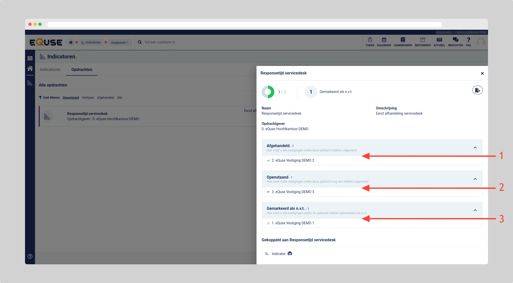 Door een opdracht aan te klikken, kunt u zien welke vestigingen de opdracht reeds hebben uitgevoerd (1), welke vestigingen de opdracht nog niet hebben uitgevoerd (2) en welke vestigingen de opdracht als niet van toepassing hebben gemarkeerd (3).