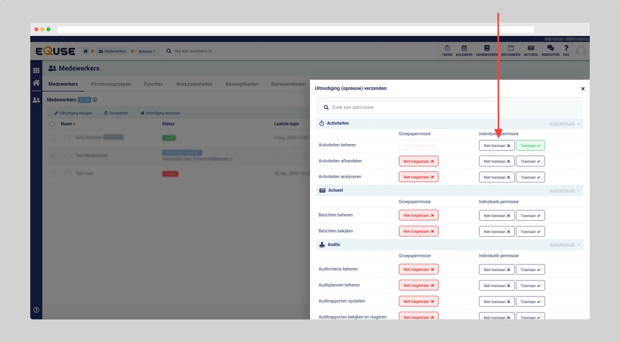 🦉 Tip: U kunt de permissies via permissiegroepen opnieuw toewijzen. Klik hiervoor op 'alles instellen' > 'herstellen naar groepspermissies'.