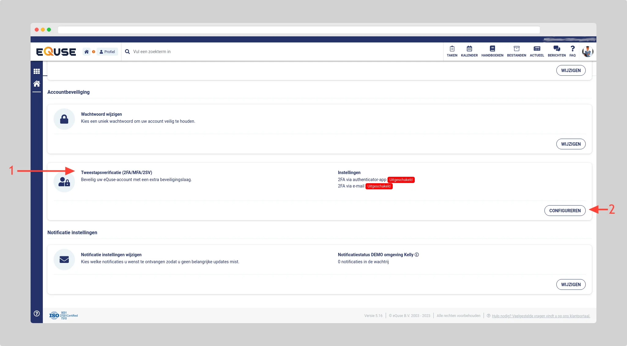 U kunt de instellingen voor tweestapsverificatie wijzigen via Profiel > Mijn profiel > Accountbeveiliging. Klik vervolgens bij Tweestapsverificatie (1) op de knop configureren (2).